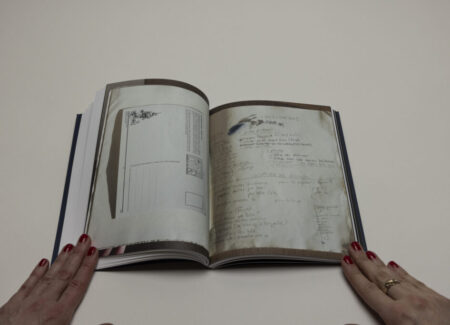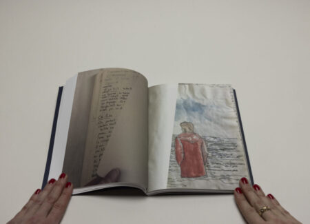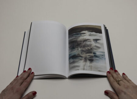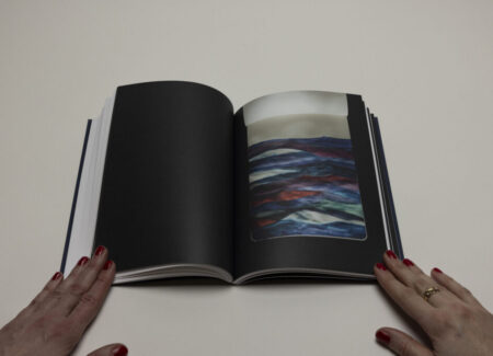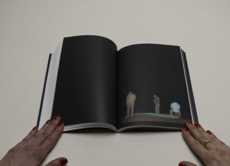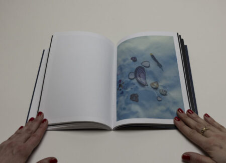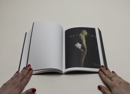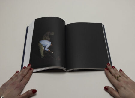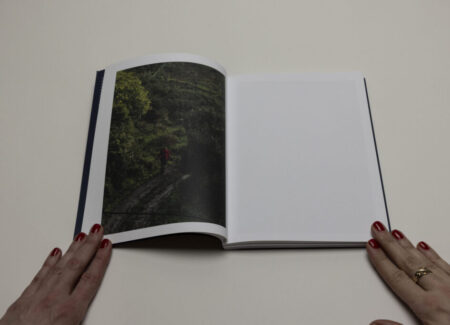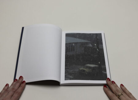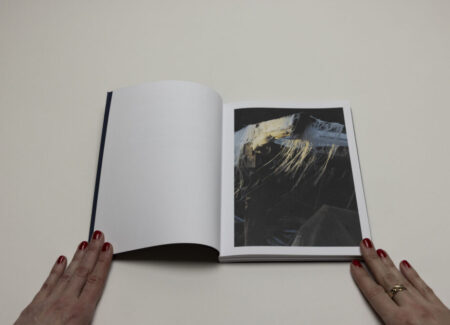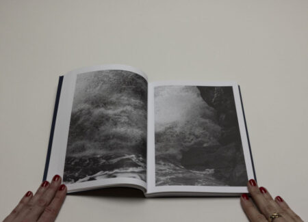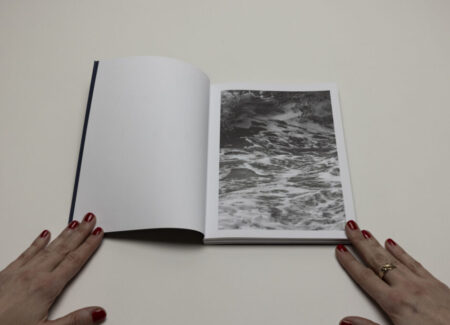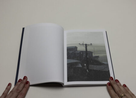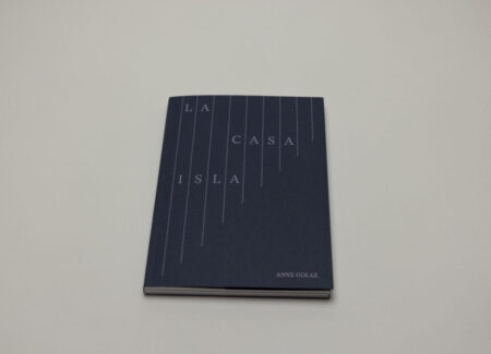 La Casa Isla is a softcover book with a quietly striking design. Its cover features delicate wavy lines in pale pink that run vertically from top to bottom, subtly evoking the movement of water and hinting at themes of solitude and nature. The title, also rendered in pink, is arranged in three clean lines against a deep navy-blue background, while the artist’s name appears in all caps at the lower right corner. Inside, the text and visuals are tightly interwoven, with photographs shifting in scale and placement to guide the rhythm. Three sections are printed on black paper, creating a visual pause, a moment of introspection that mirrors the emotional undertow of the island’s isolation. The book’s size and its layering of visual elements give it the intimate feel of a journal or field notebook.