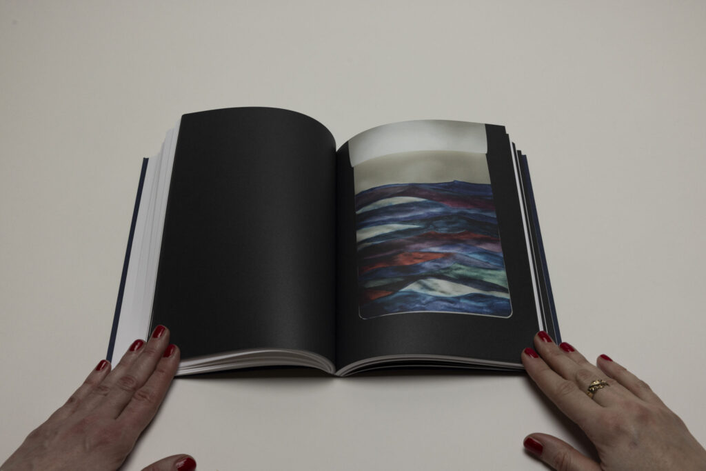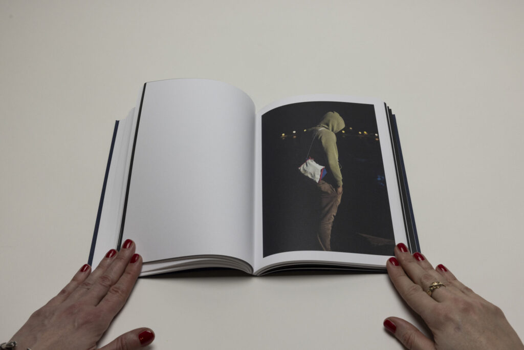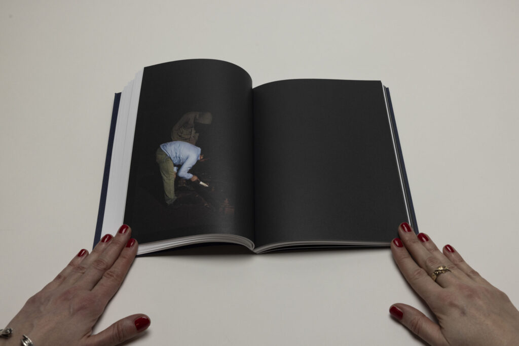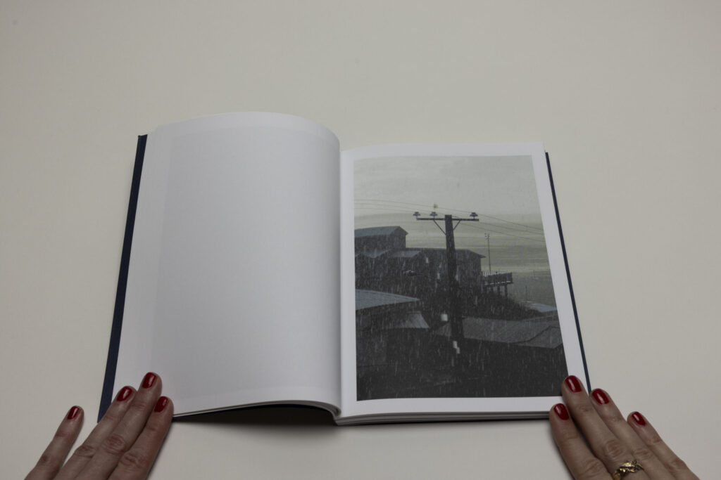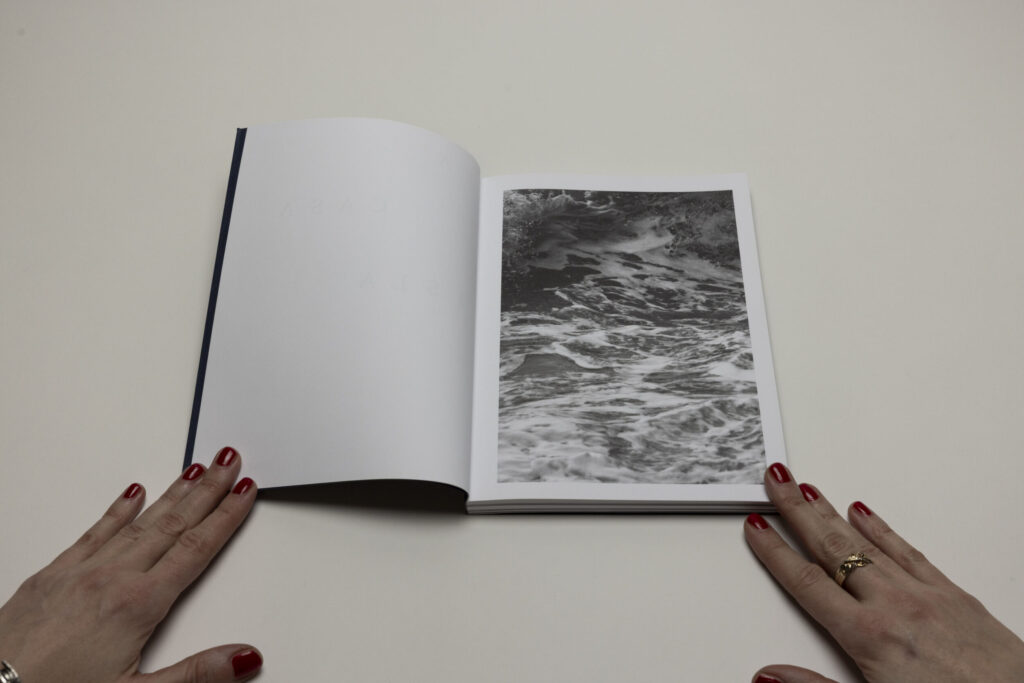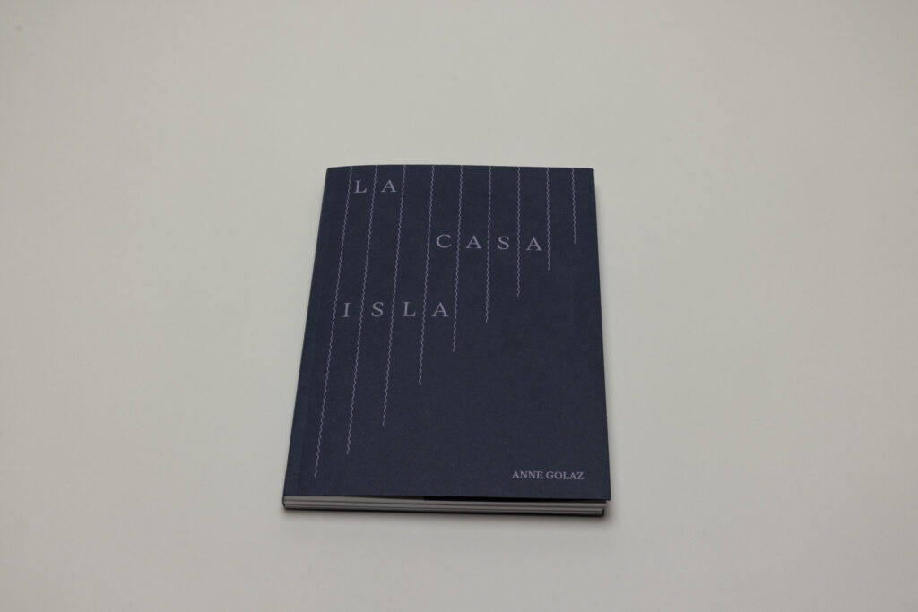 La Casa Isla is a softcover book with a quietly striking design. Its cover features delicate wavy lines in pale pink that run vertically from top to bottom, subtly evoking the movement of water and hinting at themes of solitude and nature. The title, also rendered in pink, is arranged in three clean lines against a deep navy-blue background, while the artist’s name appears in all caps at the lower right corner. Inside, the text and visuals are tightly interwoven, with photographs shifting in scale and placement to guide the rhythm. Three sections are printed on black paper, creating a visual pause, a moment of introspection that mirrors the emotional undertow of the island’s isolation. The book’s size and its layering of visual elements give it the intimate feel of a journal or field notebook.