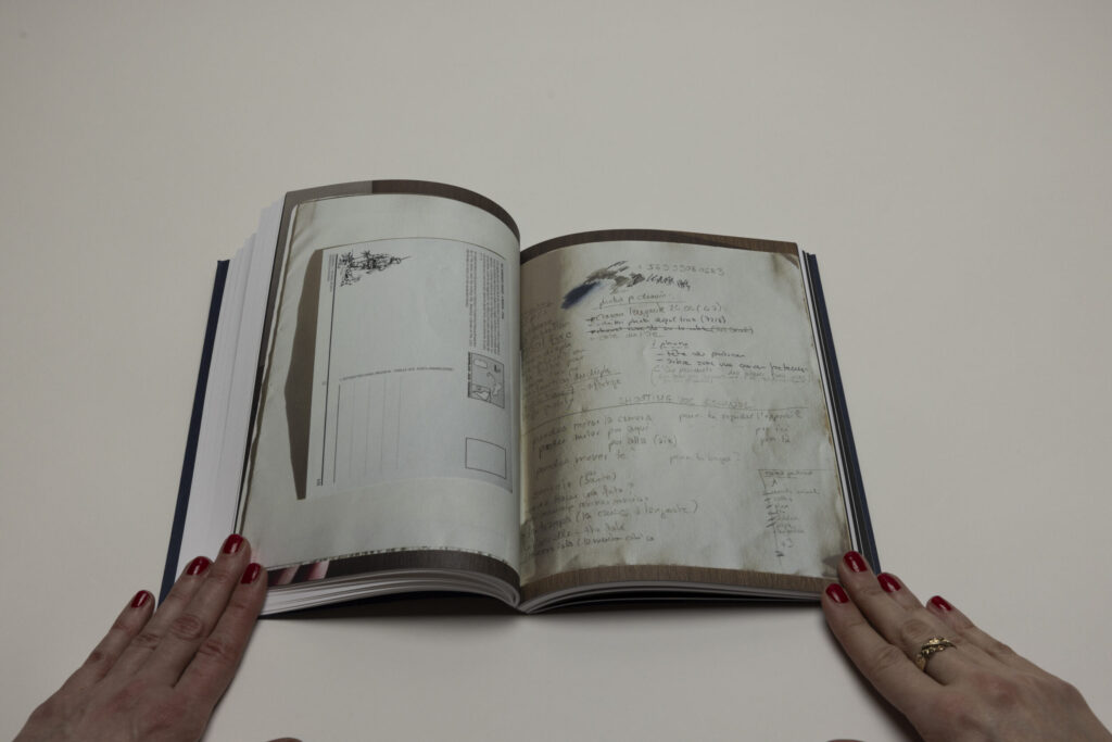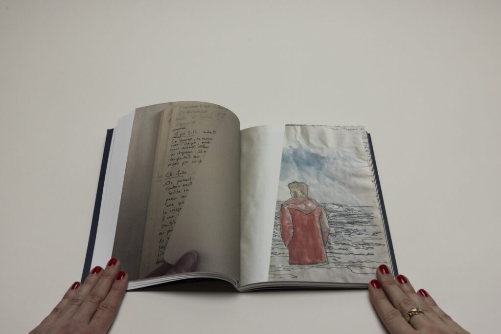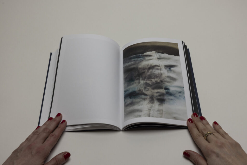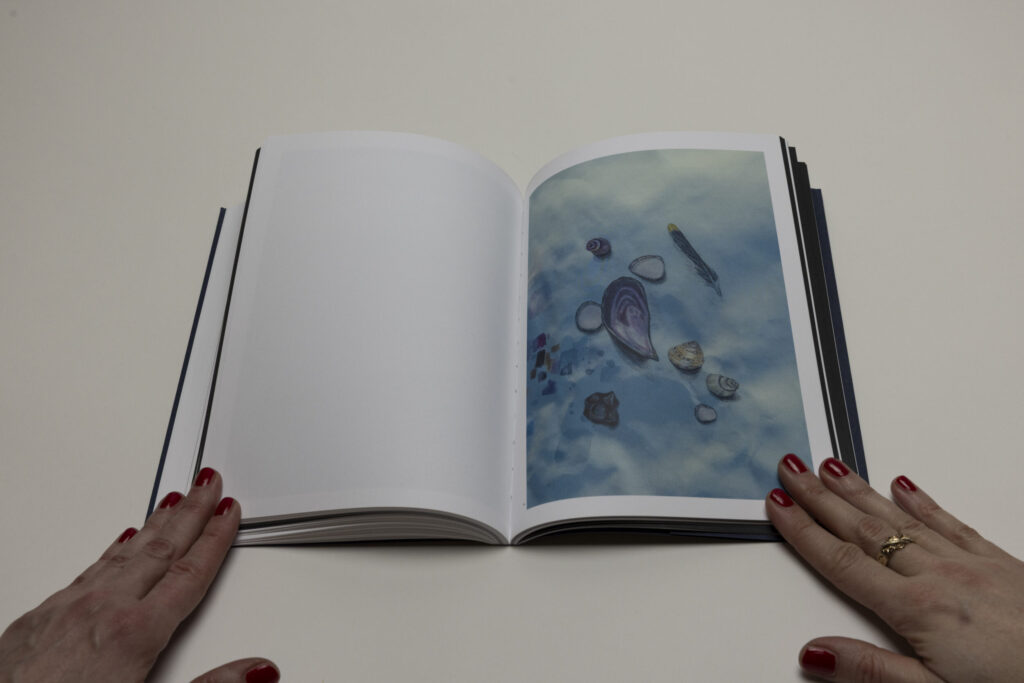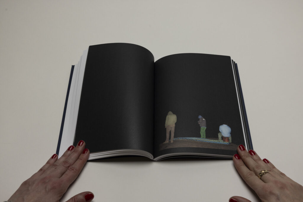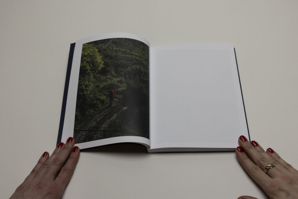 La Casa Isla is a softcover book with a quietly striking design. Its cover features delicate wavy lines in pale pink that run vertically from top to bottom, subtly evoking the movement of water and hinting at themes of solitude and nature. The title, also rendered in pink, is arranged in three clean lines against a deep navy-blue background, while the artist’s name appears in all caps at the lower right corner. Inside, the text and visuals are tightly interwoven, with photographs shifting in scale and placement to guide the rhythm. Three sections are printed on black paper, creating a visual pause, a moment of introspection that mirrors the emotional undertow of the island’s isolation. The book’s size and its layering of visual elements give it the intimate feel of a journal or field notebook.