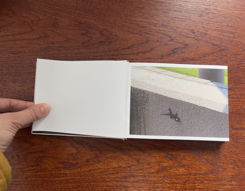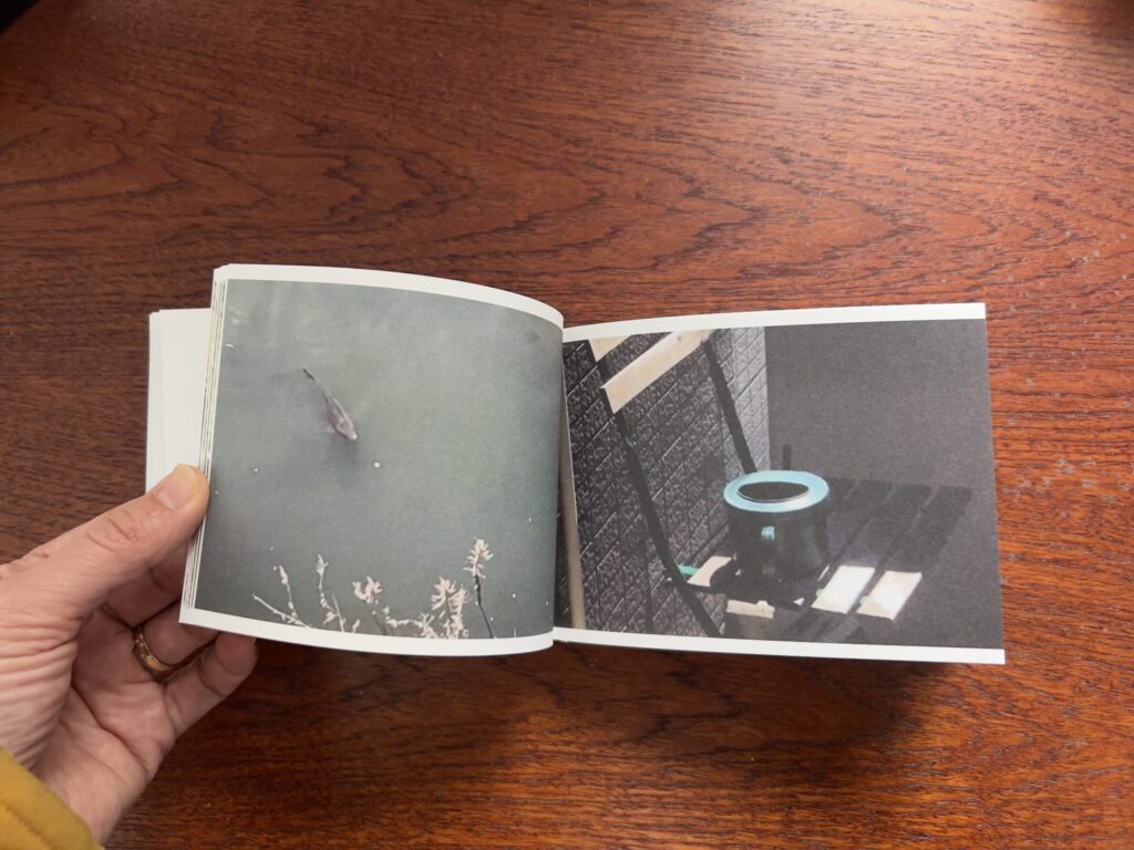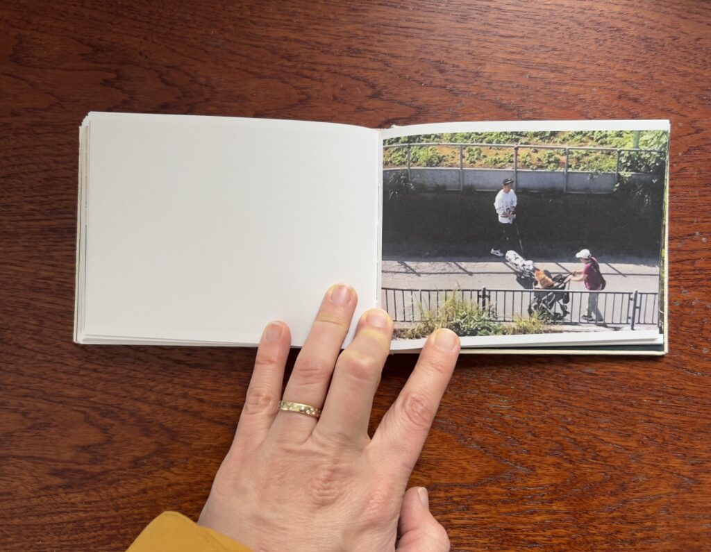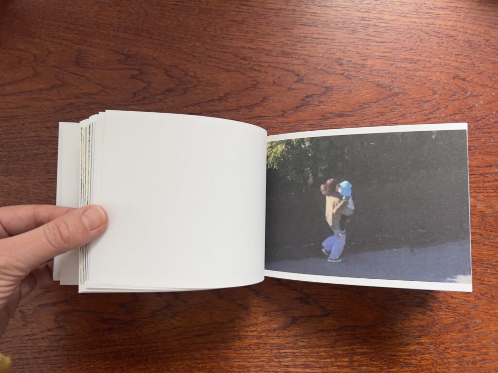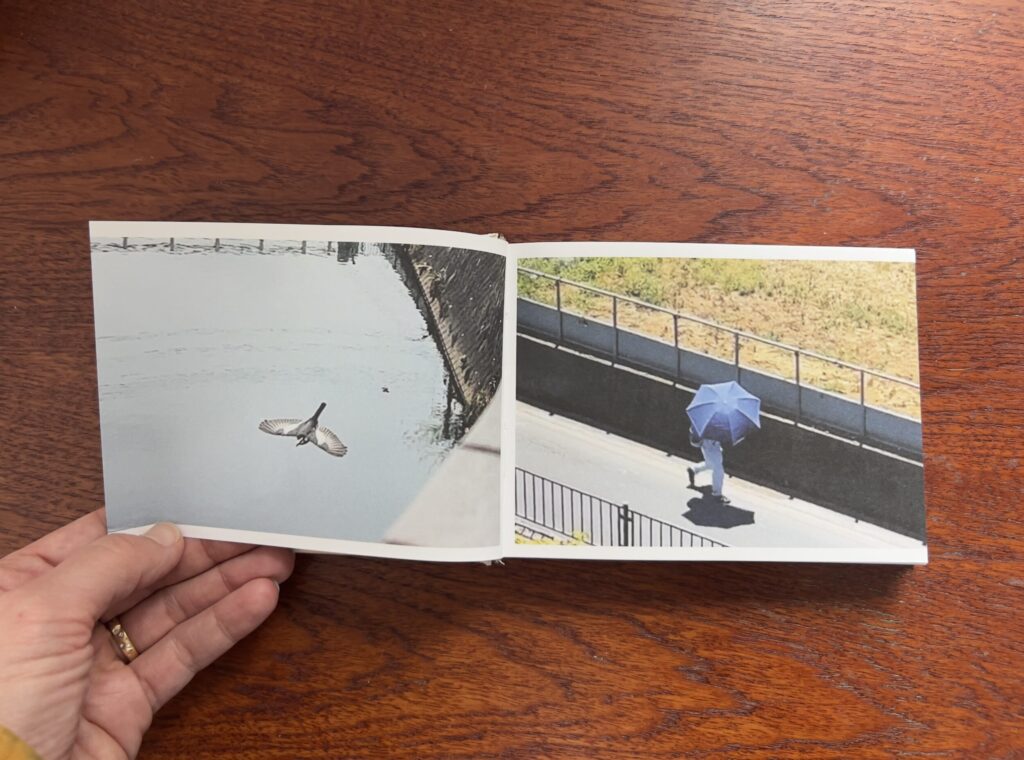 I was drawn to this book at Chose Commune’s table at the New York Art Book Fair in September of 2025. The book’s petite size and its humble, creamy bamboo color called out to me amidst the overwhelm of the warm and crowded fair. My initial flip through the book was a surprising one. At first blush I thought the images were screenshots from surveillance footage, perhaps CCTV footage or Google Street View. The digital grain aesthetic of the screenshot-grabbed photographs felt familiar to the tropes of watching and being watched. Returning to the book in the comfort of my own space, the suite of images spoke differently. It became clear that the author was not taking moments from footage captured by a machine but rather selecting single images from footage recorded by the keen and sensitive eye of a person responding to the world in which they find themself; a world filled with dynamism, color, shimmer, and tempo.