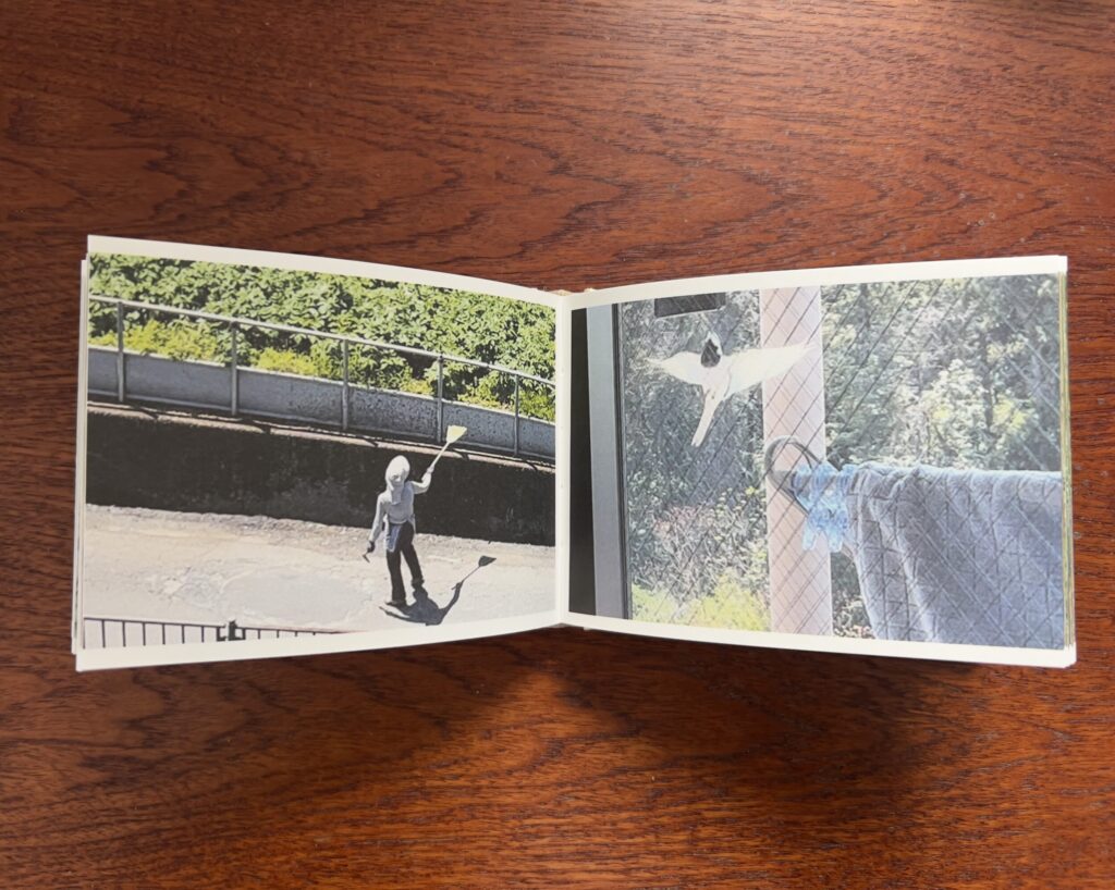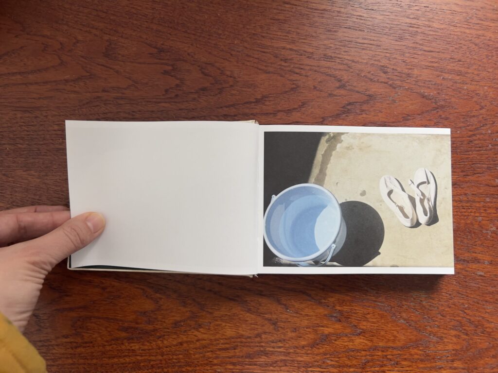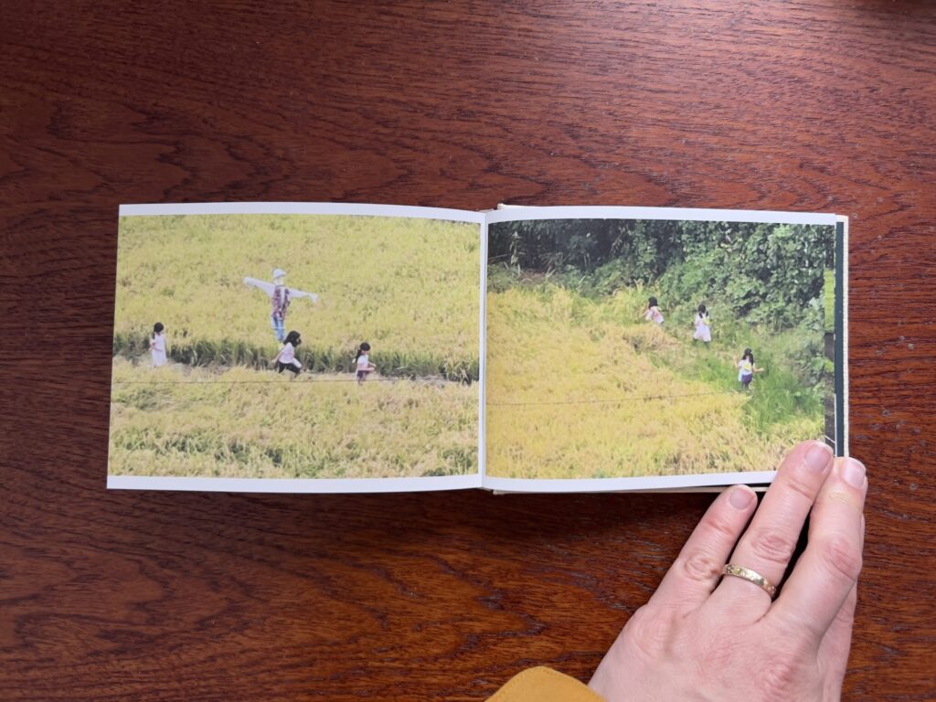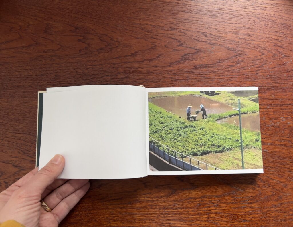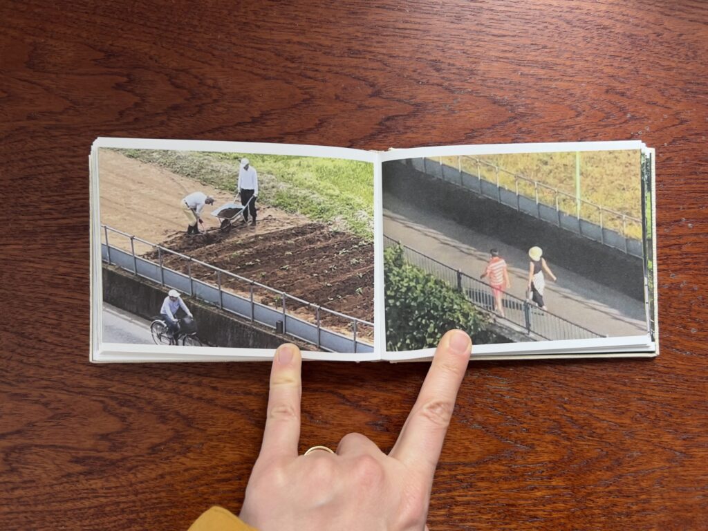 The images reproduced in the book are of low fidelity, meaning they are not exacting in their sharpness; they have a soft focus and a digital feel. These qualifiers are often negative and near-damning when discussing photography, but in the case of Tortosa Santisteban’s work, the softness and digital feel are welcome impurities, in direct opposition of the contemporary trend to see the world in hyperrealistic clarity. The softness of the images suggests a distance, even when the subject of the images is the stuff of the artist’s own balcony: a blue pail and white slippers, a brown blouse hanging up to dry, the artist’s watering can resting on a folding chair, or potted plants sitting on a ledge. These images are thoughtfully interspersed with scenes looking further into the distance, at a downward perspective which creates unique angles and opportunities for cuts and formal ordering from a birds-eye-view: people with their heads shielded from bright overhead sun working in the rice field, shoveling earth into a wheel barrow. Other scenes show people existing next to the rice field: a man riding his bike while two other people tend to the field just over the fence from the path, schoolgirls walking three-wide, which reveals that the walking path is hemmed in by the river on one side and the rice field on the other, and among my favorites, a spread that shows three children playing in the rice field on the left facing page and running toward the forest on the right facing page. This last set of images pairs two still frames extracted from a single video, sharing the humanity and subtle humor of moments one sees when it seems no one is watching. Other themes included in the stills depict the richness of nature in Kanagawa: the chameleons that enjoy the heat of sun and try to blend themselves into cement, the river and the koi that call the river home, and the birds who feast on the creatures of the waters and the rice field. Overall, the images have a cohesive gentleness to them that is quiet, calm, and attentive.