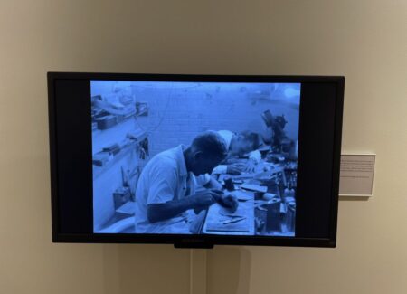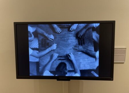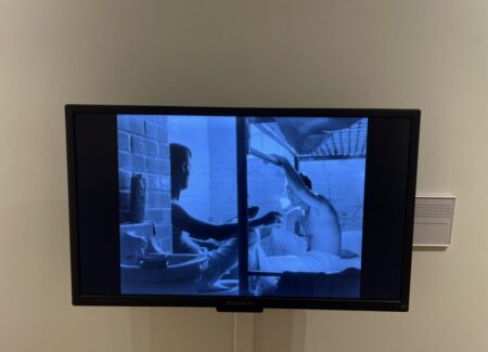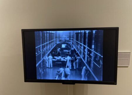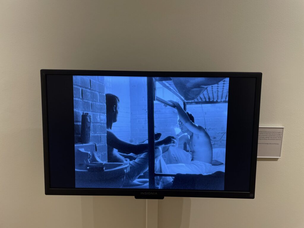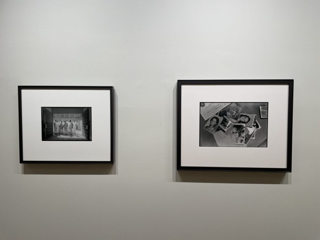Conversations with the Dead was one of the first photobooks to integrate ephemera into its narrative, and a vitrine of personal letters and drawings from inmates reinforces how richly important this material was to the empathetic human story Lyon was trying to tell. Lyon himself would also start to make his own handwritten annotations and decorations on his prints to give further context to his images, as seen in a repeated film still print to which Lyon added his own frustrations with the realities of incarceration he witnessed firsthand.