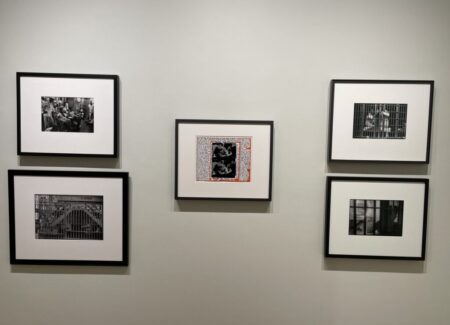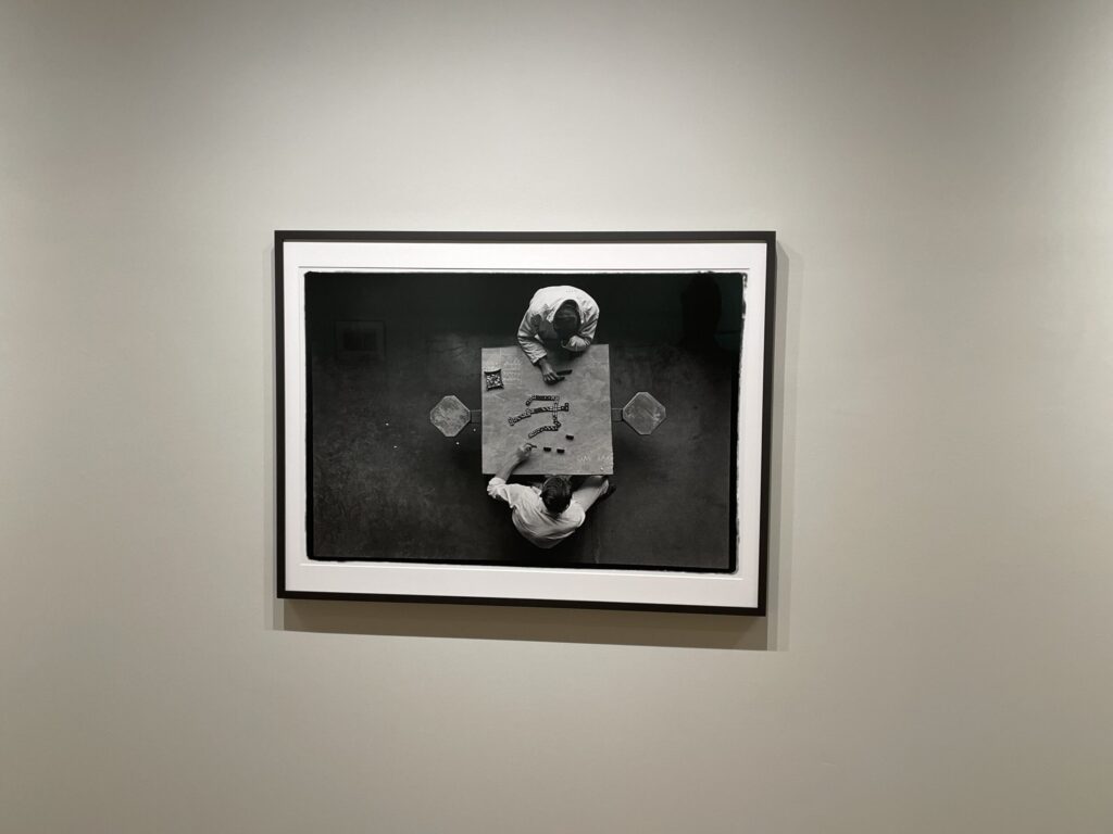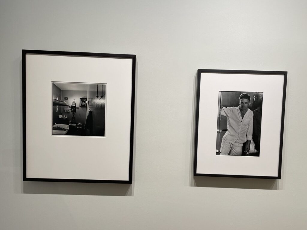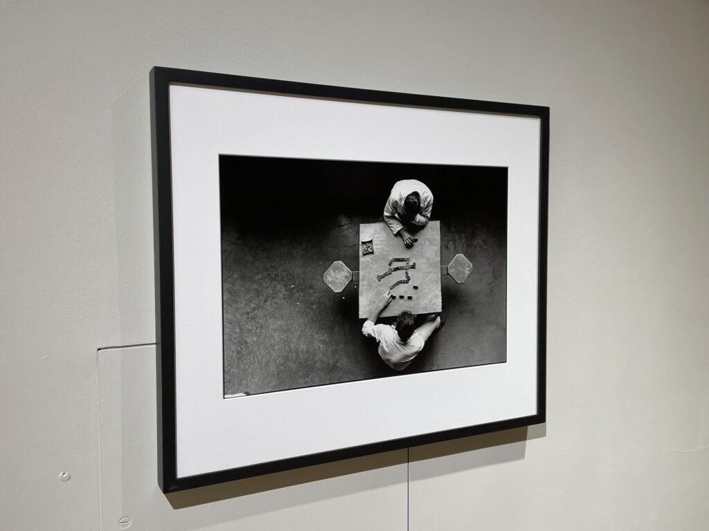 Lyon also used the available light with mastery. With prisoners outfitted in full length white jumpsuits and the light often filtered from exterior windows or flared from single bare bulbs, bright contrasts of monochrome light and dark were consistently available, and compositionally Lyon made the most of them to backlight or silhouette figures, to create dappled areas of whiteness amid the dark gloom, and to create ethereal almost religious glows that amplify the emotional range of the scenes. A famous image looks down on two inmates playing dominoes on a cell block table, but other portraits feel even more poignantly intimate, with faces framed by bars, bodies standing in iron doorways, and gestures made from behind walls of bars, each individual (as named in titles and captions) seen with attentiveness, compassion, and genuine connection.