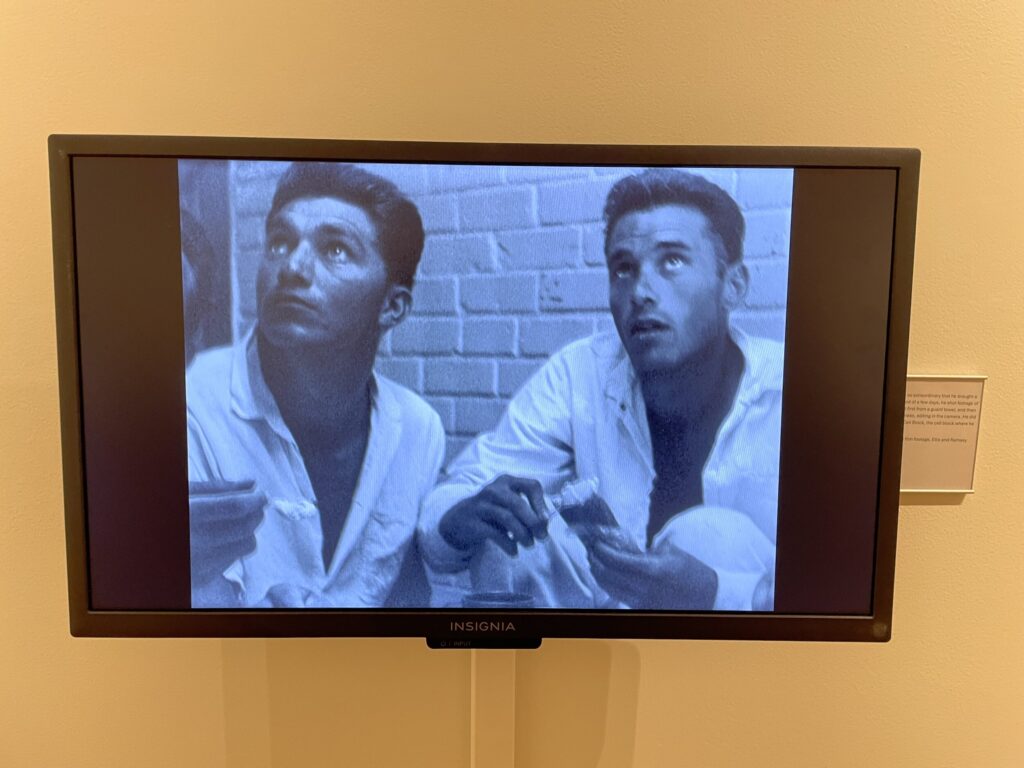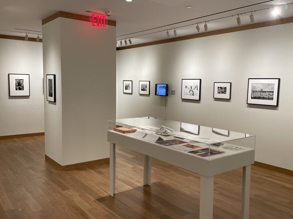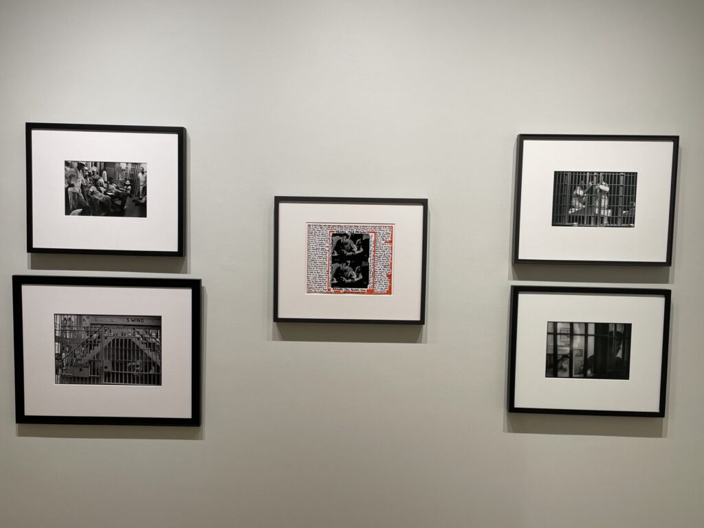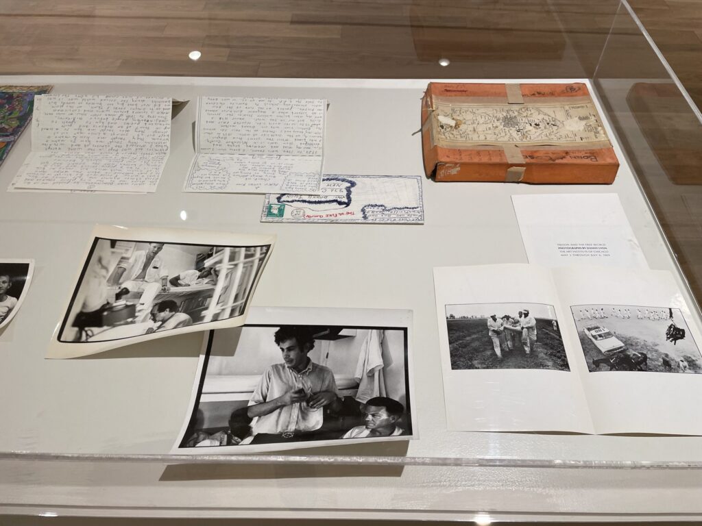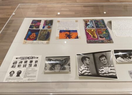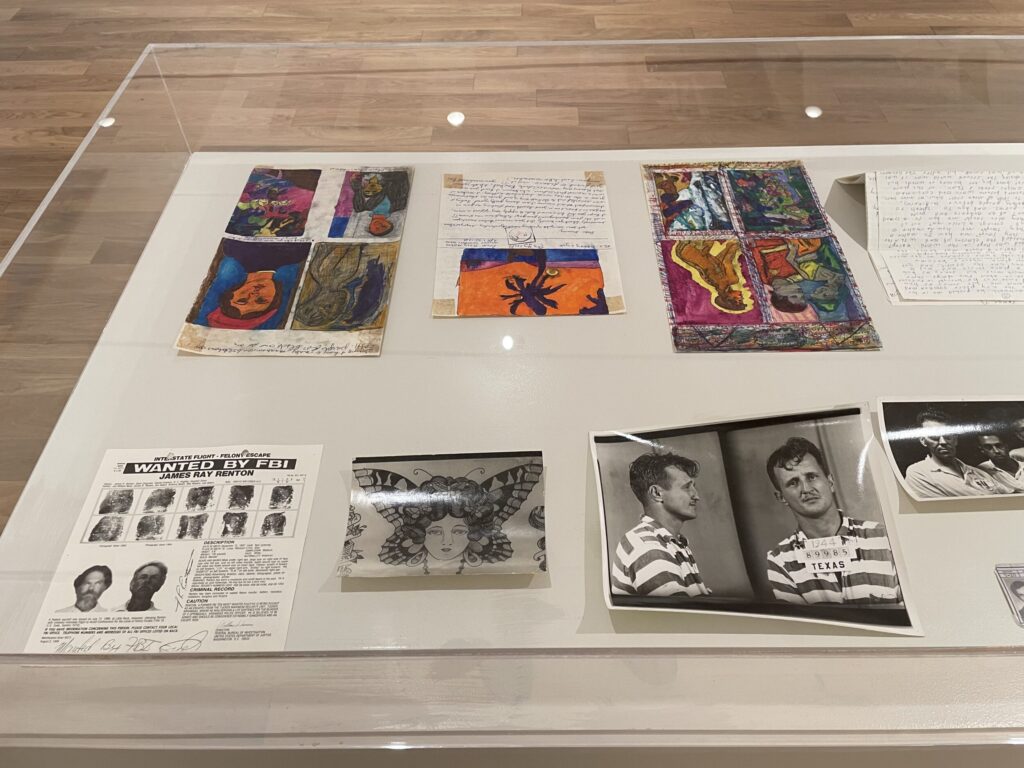 - (vitrine): miscellaneous images, FBI wanted poster, prisoner letters/drawings, exhibition announcement, decorated print box