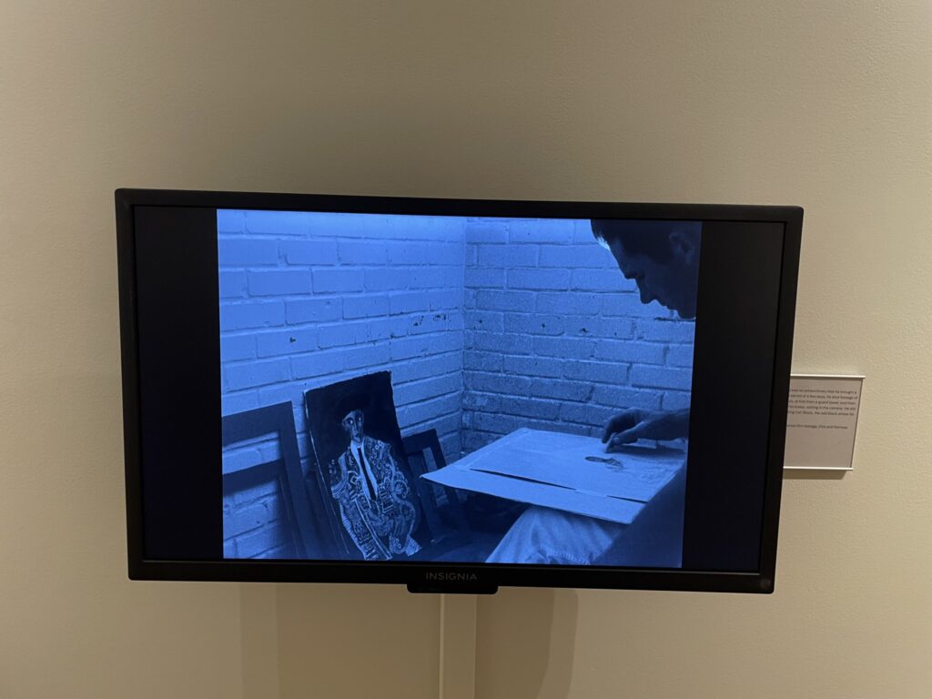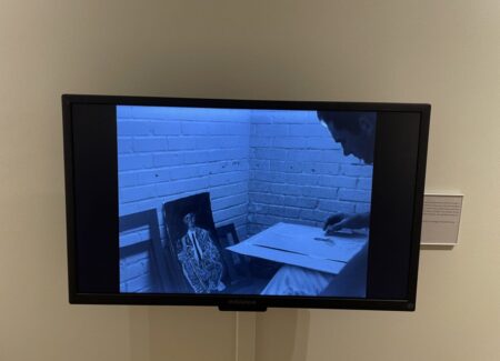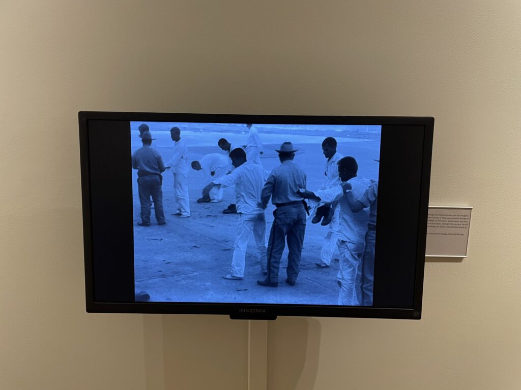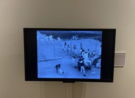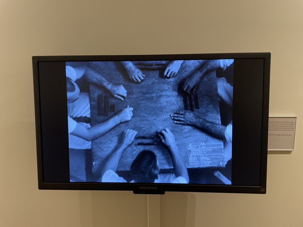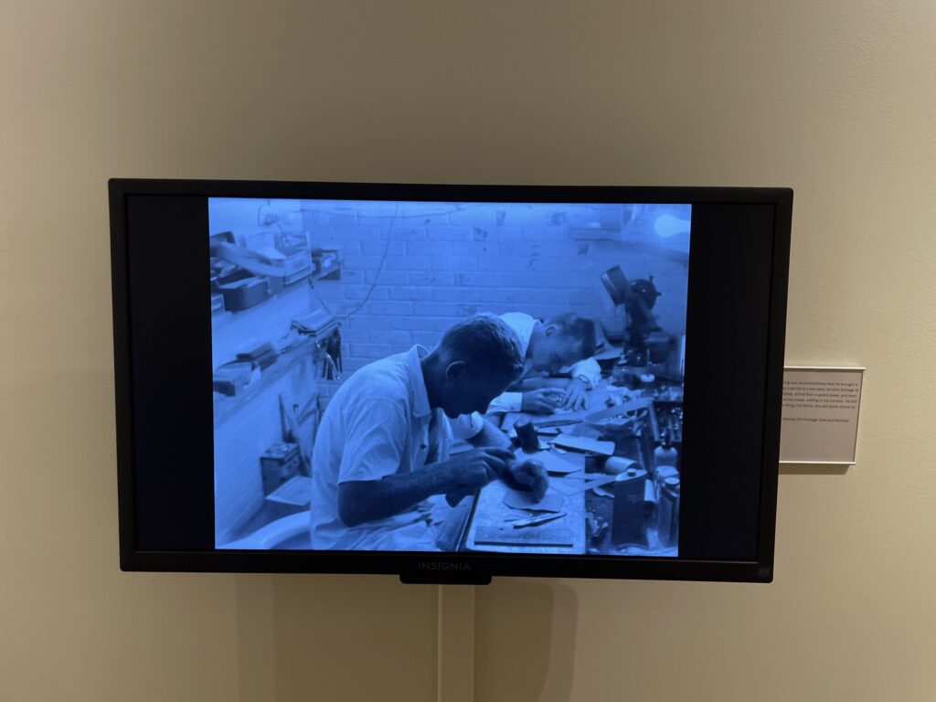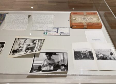 - (vitrine): miscellaneous images, FBI wanted poster, prisoner letters/drawings, exhibition announcement, decorated print box