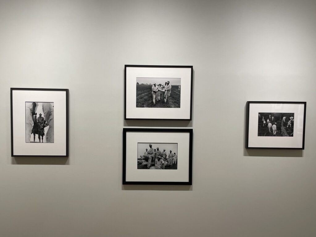 While the appearance of casual ease and personal identity filled many of Lyon’s interior images, his images outside tended to feature groups of men who were largely anonymous. The white clad figures cluster in groups and bunches – picking and hauling cotton, chopping down trees, riding in trucks, and tilling the soil with hoes – their jumpsuits and hats creating patterned spots of white and ordered lines across Lyon’s compositions. The work was clearly physically hard and exhausting, with the Texas heat taking its toll – Lyon’s images document several fallen bodies carried out of the fields and placed in the back of trucks to be transported away. Small moments of camaraderie among the prisoners are visible here and there, with smiles breaking out during periods of rest or when the day’s work was done, but the harsh menace of the system was never far from view, often in the form of looming cowboy-hatted guards on horseback, their physical position above the prisoners always amplified. One particularly ominous image shows a tangle of handguns dangling on a hook being dropped down from the prison tower to the guards outside, with a loose line of prisoners in the distance, the threat of violence visible for all to see. The days outside then end with hurried shakedowns, each prisoner patted down and searched in succession, arms outstretched with obvious symbolism.