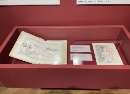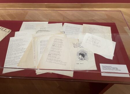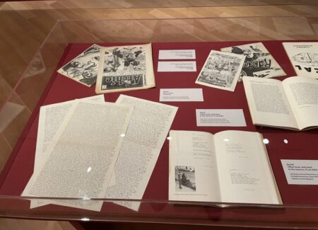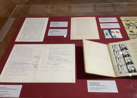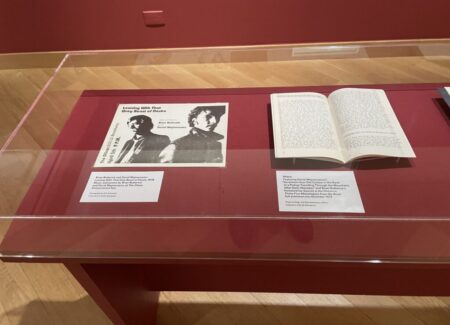 - (vitrine): 2 pages typescript, n.d.; 1 journal 1979; 1 letter, 1979; 1 typescript page, n.d.; 1 felt tip pen on card stock, 1979; 2 offset book, 1980s; 1 flyer, 1983; 2 letters, 1980