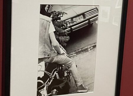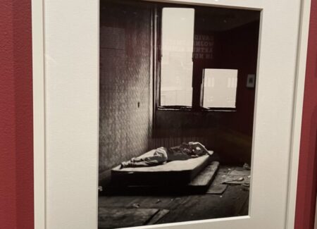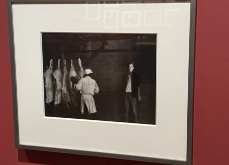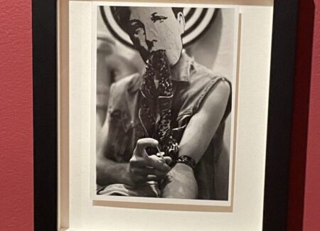 Wojnarowicz channels Rimbaud’s irreverent rebel persona in plenty of setups, from posing him on motorcycles (one featuring a clever reflection in the side mirror) to having him play with handguns (leading to his splayed body on a tile floor, the handgun still in his hand). Soon he’s hanging out with the meatpackers and their bloody carcasses, posing with a palm reader’s mural, and sporting a bandaged hand from some unexplained injury. The mood quickly turns darker as we find Rimbaud smoking a cigarette in a tank top, lying on a dirty mattress in a sordid squat, posing near shadowed windows, peeing in a dank toilet, and shooting up with a needle in his arm. Several heroin-themed Rimbaud images are sprinkled through the show, some ultimately illustrating a 1980 story about the drug’s popularity in the Soho Weekly News.