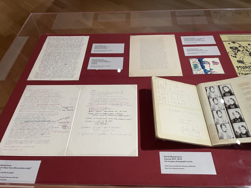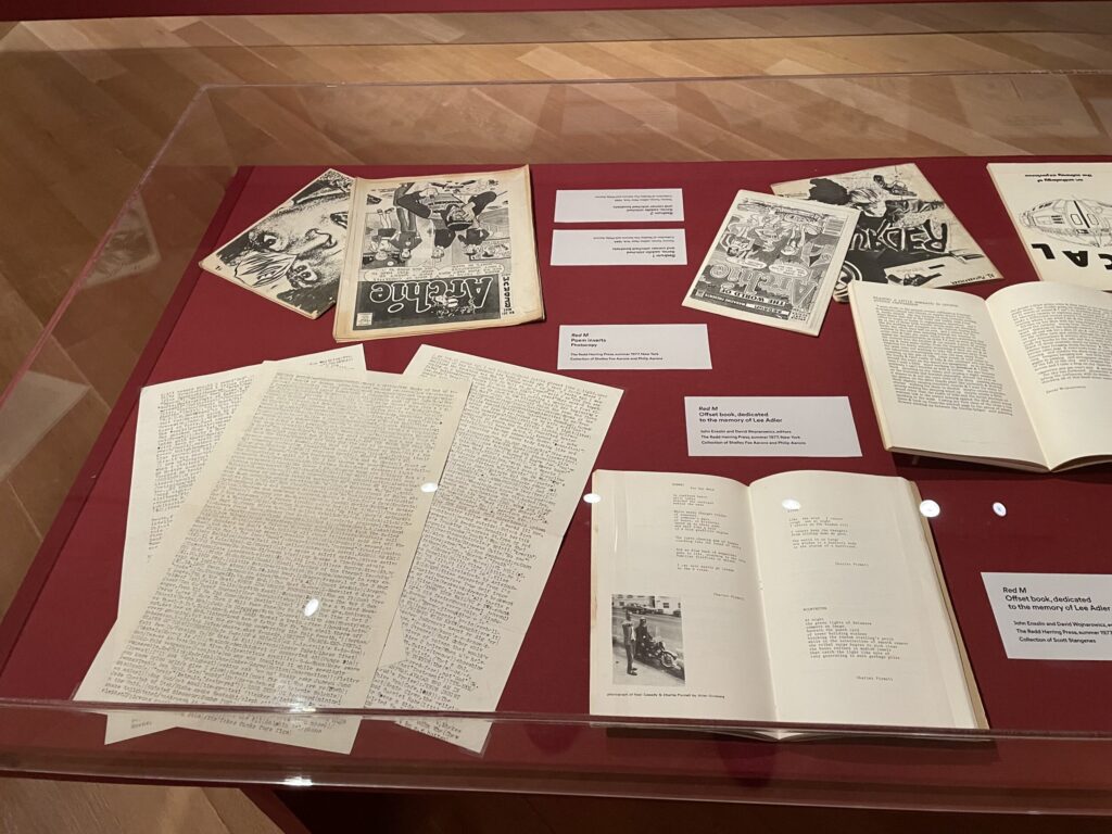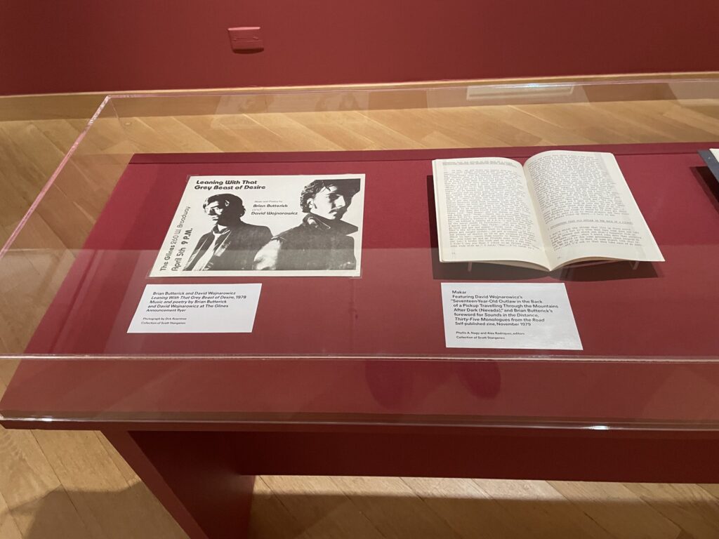 - (vitrine): 2 pages typescript, n.d.; 1 journal 1979; 1 letter, 1979; 1 typescript page, n.d.; 1 felt tip pen on card stock, 1979; 2 offset book, 1980s; 1 flyer, 1983; 2 letters, 1980