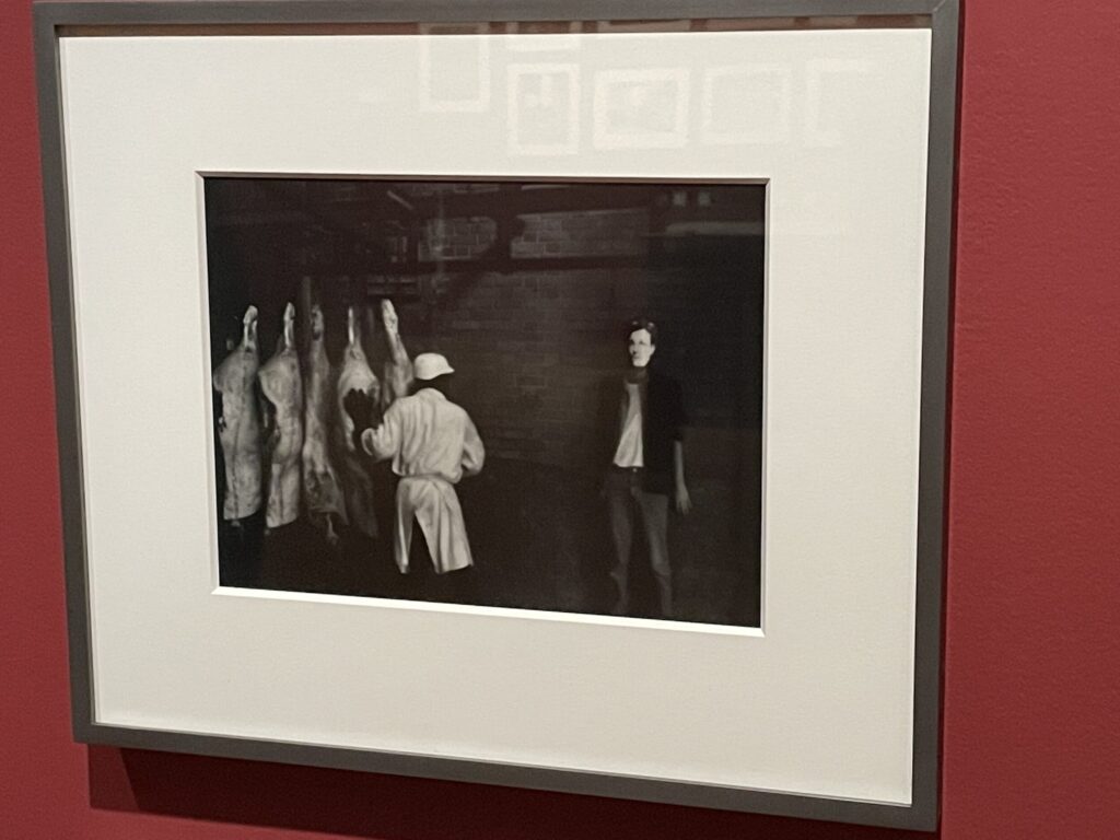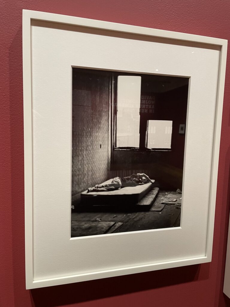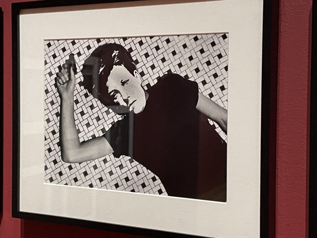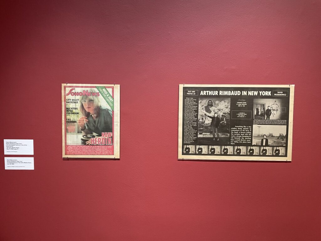 Wojnarowicz channels Rimbaud’s irreverent rebel persona in plenty of setups, from posing him on motorcycles (one featuring a clever reflection in the side mirror) to having him play with handguns (leading to his splayed body on a tile floor, the handgun still in his hand). Soon he’s hanging out with the meatpackers and their bloody carcasses, posing with a palm reader’s mural, and sporting a bandaged hand from some unexplained injury. The mood quickly turns darker as we find Rimbaud smoking a cigarette in a tank top, lying on a dirty mattress in a sordid squat, posing near shadowed windows, peeing in a dank toilet, and shooting up with a needle in his arm. Several heroin-themed Rimbaud images are sprinkled through the show, some ultimately illustrating a 1980 story about the drug’s popularity in the Soho Weekly News.