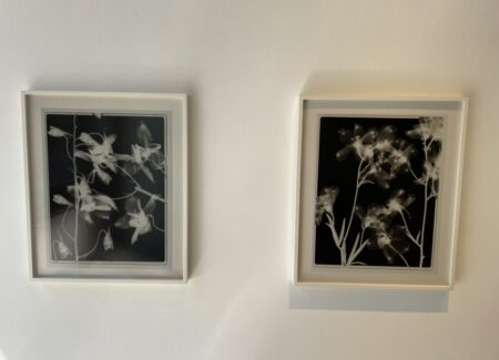 The paravents also provide handy space for the display of a few additional photographs. These black-and-white works were largely made by Oppenheim while working in the Steichen archives, as reprints of Steichen images she found there or stills of florals on display nearby. She then went back to her own darkroom and made several more floral images (and photograms) inspired by Steichen’s examples, creating yet another layer of thoughtful rework and re-interpretation. In this way, the paravents feel nested, with Oppenheim working inside Steichen, bringing her own artistic perspective to his world, and again, knowledge of the backstory enriches the interpretation of the resulting objects.