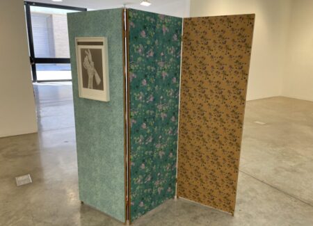 - 1 three-paneled paravent with 2 attached gelatin silver prints, 2025, sized roughly 73×71 inches