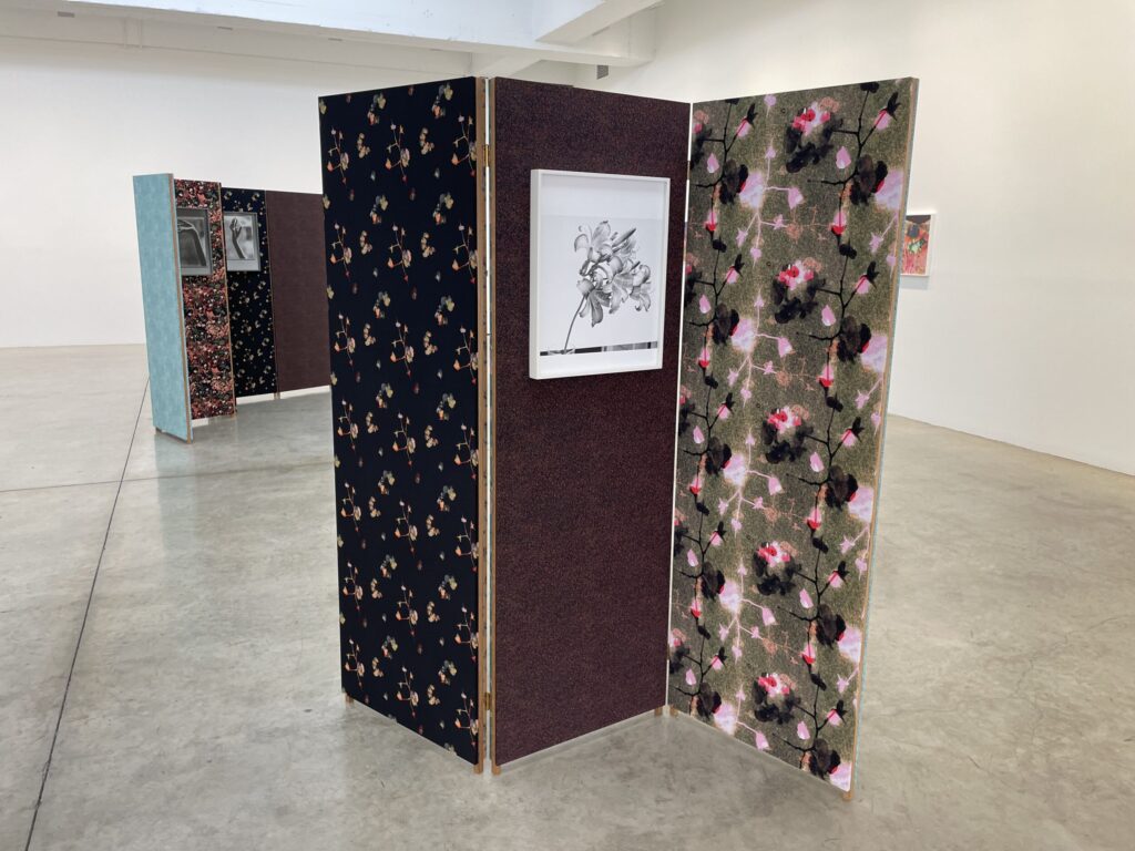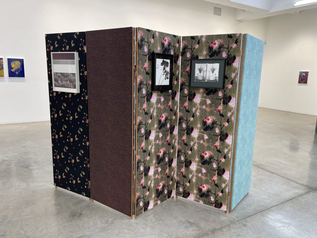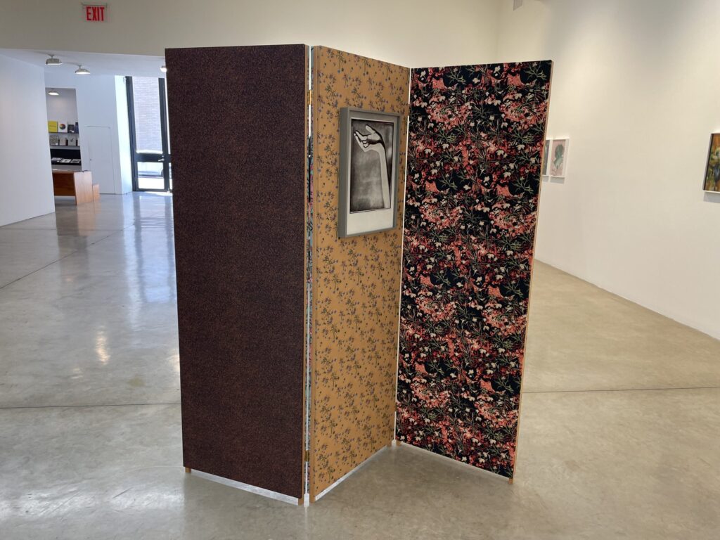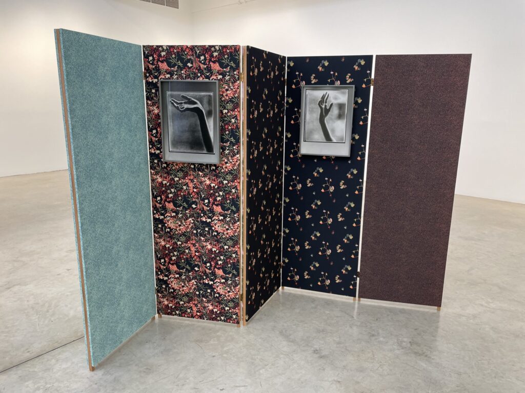 - 1 three-paneled paravent with 3 attached gelatin silver prints, 2025, sized roughly 72×71 inches