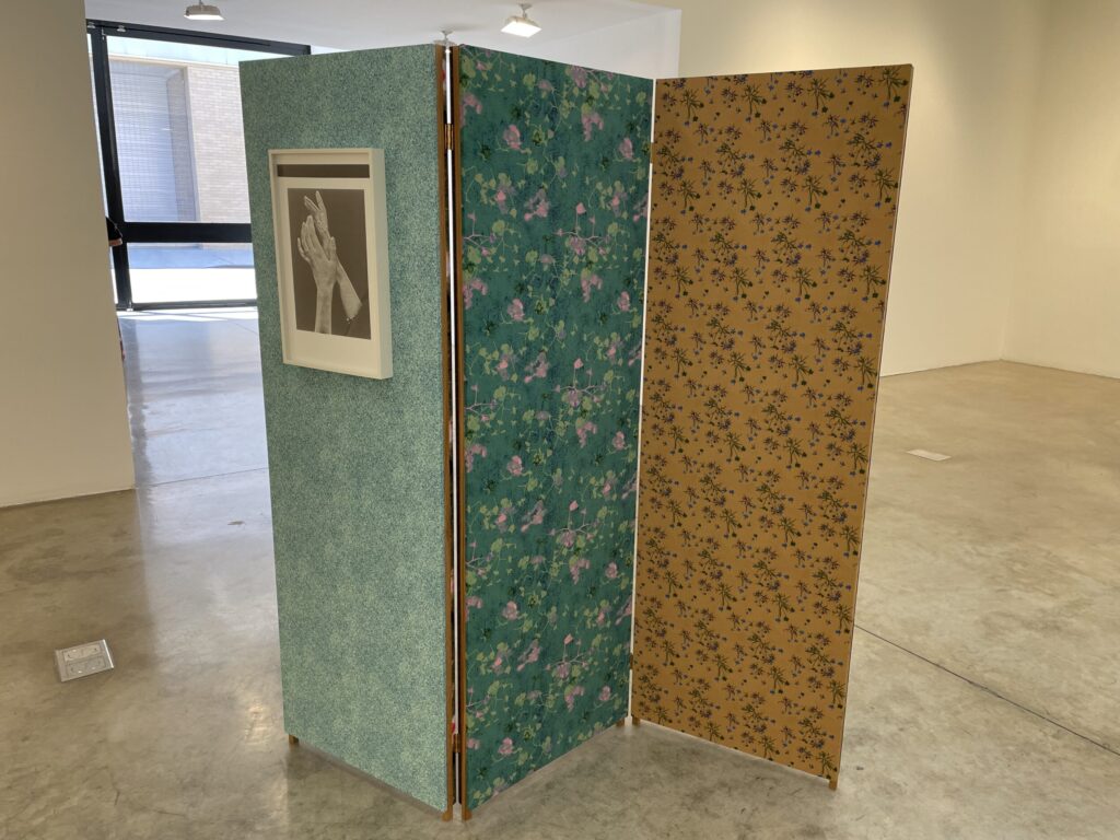 - 1 three-paneled paravent with 2 attached gelatin silver prints, 2025, sized roughly 73×71 inches