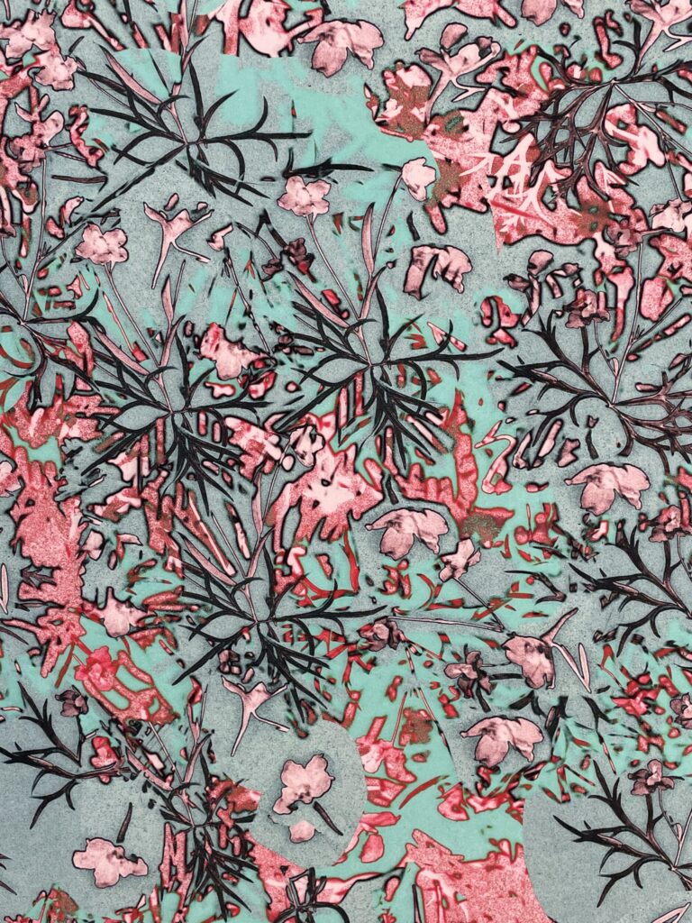 In the center of this gallery installation, Oppenheim has staged three multi-panel screens or paravents. These works connect back to Steichen’s efforts in fabric design, in collaboration with Stehli Silks back in the 1920s and 19930s. Oppenheim combed through Steichen’s archives and unearthed a number of images he made but didn’t actually use for textiles, and in collaboration with the fashion designer Zoe Latta, Oppenheim created several new fabrics from Steichen’s original pictures – and it is these fabrics that cover the paravents. Most of the new designs create repeating patterns of florals or tactile swaths of gravel, in a range of colors. One standout pattern features a brash mix of pink and light blue, the curved edges of Oppenheim’s digital manipulation of the underlying florals altogether visible.