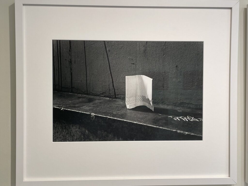 The found elegance of a standing envelope and a graffiti tag. Mark Cohen (from 2023) in the back room at Howard Greenberg Gallery.