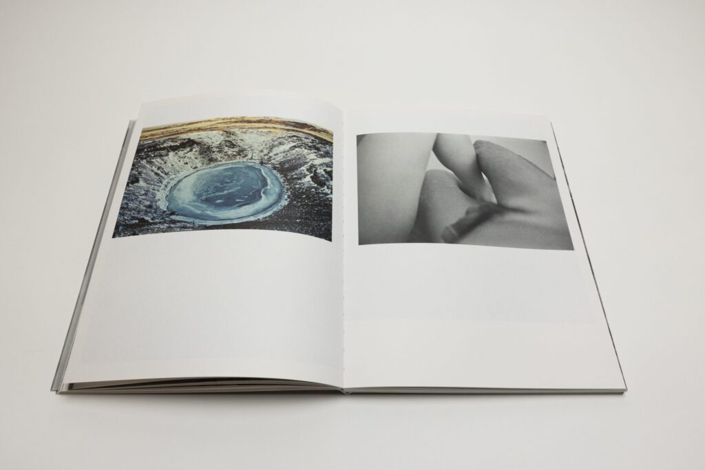 This editing is intentional, with image pairings carefully constructed to elicit conceptual resonance. One juxtaposes a vivid blue geothermal pool, its surface steaming against the dark, textured earth, with a black-and-white photograph of two pairs of legs gently touching, a quiet gesture of intimacy. Together, the pictures evoke a dialogue between the cosmic and the corporeal, and a meditation on the deep interconnectedness of humans and nature.