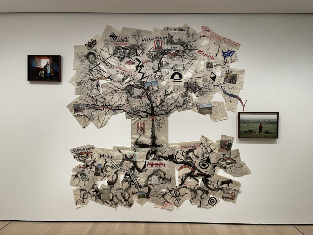 - Lindokuhle Sobekwa: 1 installation with photographs, Japanese kozo paper, gampi paper, colored pencil, oil pastel, acrylic paint, and polymer photogravure, 2025, site specific