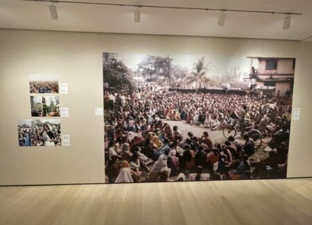 When we turn to Kathmandu, Prasiit Sthapit’s project documenting the riverside settlement of Susta along the border of Nepal and India and its shifting location due to the eroding path of the river is conceptually one of the strongest projects in this show; there is so much thoughtful complexity in the idea of the climate-driven drift of a river forcing a community to straddle different border/national realities. And of the dozen or so prints included (on a small and difficult to see leporello), there are a handful of subtly seen color compositions, making Sthapit’s photographic potential the most tantalizing of the lesser known artists on view in this show. Sheelasha Rajbhandari’s works pack an emotional punch, particularly an installation of small golden beds with images of female faces and bodies printed on linen and hand embroidered with short testimonials and commentaries that consider the plight of married women in Nepal; their phrasing (like “my nightmare had become my reality”) brings a Jenny Holzer or Barbara Kruger text-driven bite to the overlooked burdens and taboos of traditional marriage, but the underlying photographic portraits (archival or other) are really only a small part of the larger artistic effort. And while the photographs included the photobook The Public Life of Women (drawn from the Nepal Picture Library) document a range of speakers, meetings, protests, and female activism across the decades, these anonymous images are resolutely documentary, showing us evidence of important and under known stories to be sure, but falling far outside the scope of what “New Photography” typically includes, even given the recent interest in recovering lost archival histories.