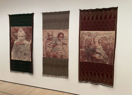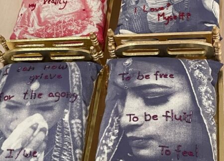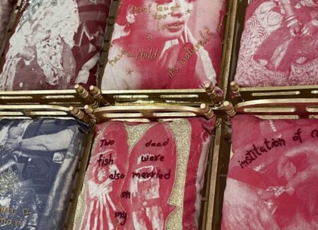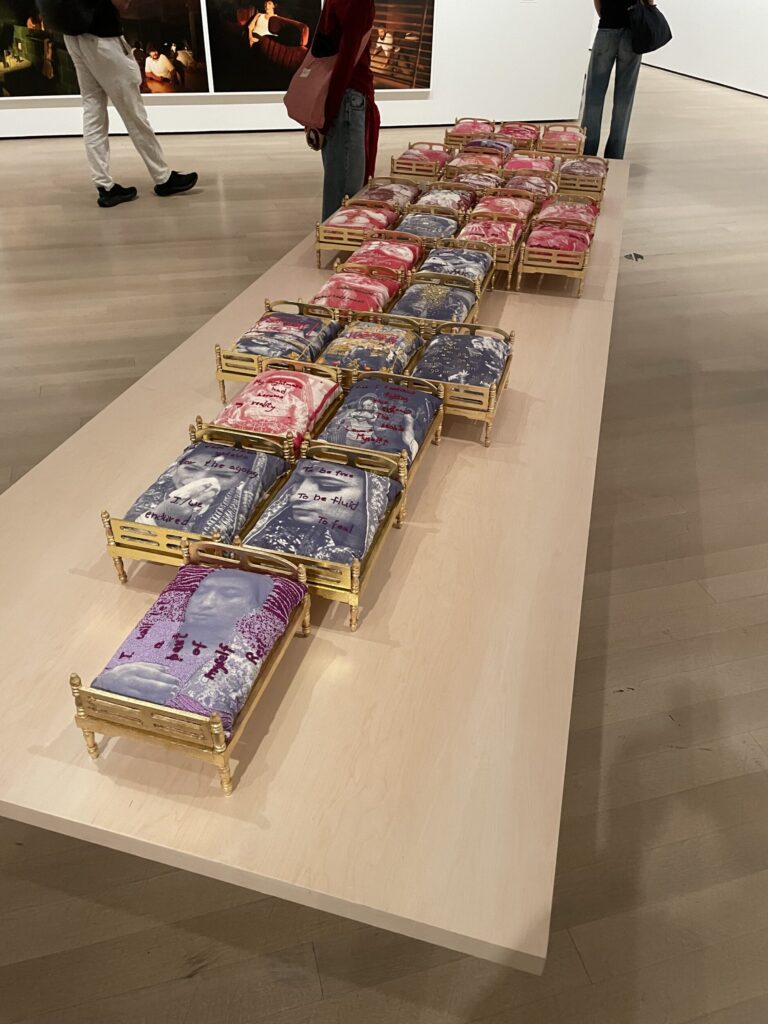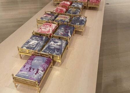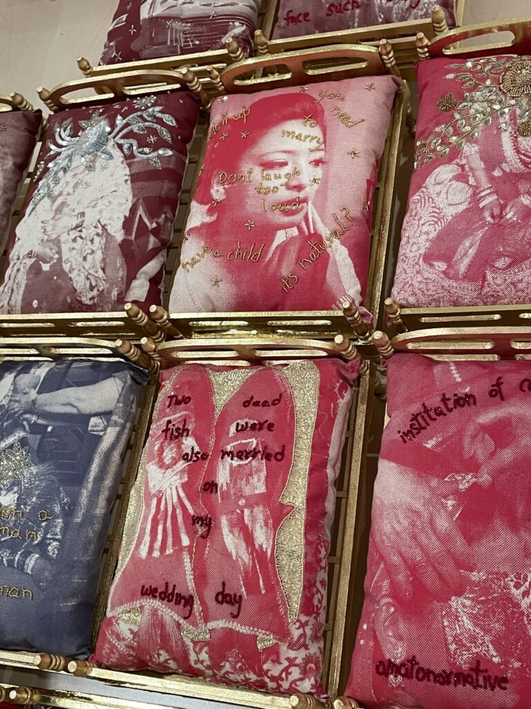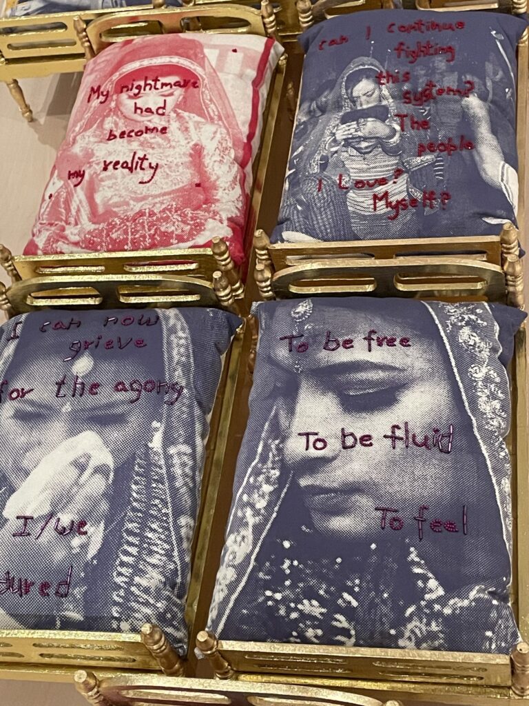 - Sheelasha Rajbhandari: 3 silkscreen prints on cotton, sheep wool thread embroideries, mixed cotton, 2020, each sized roughly 83×43 inches; 30 inkjet prints on linen, embroidery thread, metal thread, glass beads on 30 beds, wood, imitation gold leaf, 2023, each sized roughly 12x8x7 inches