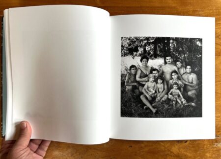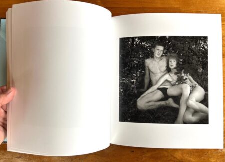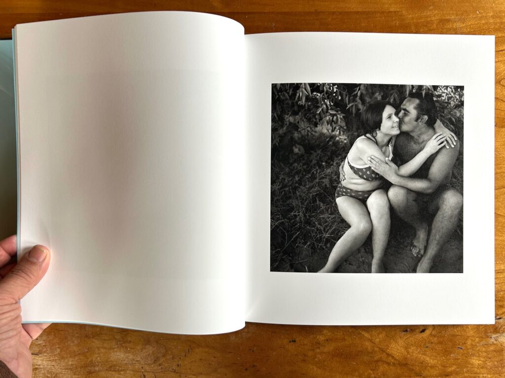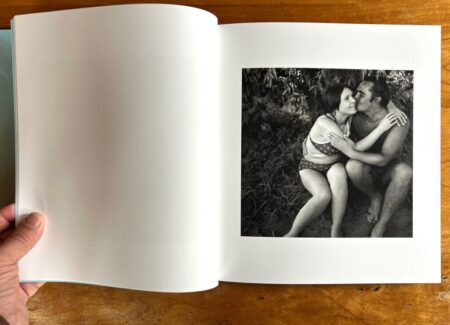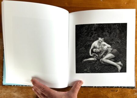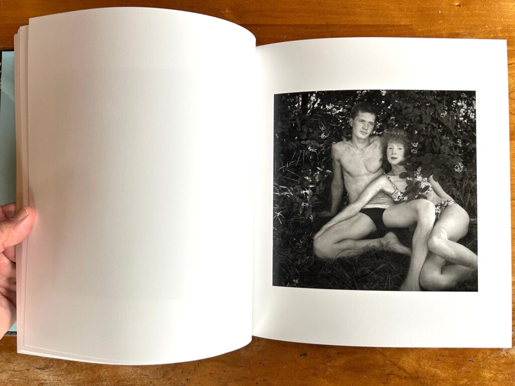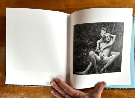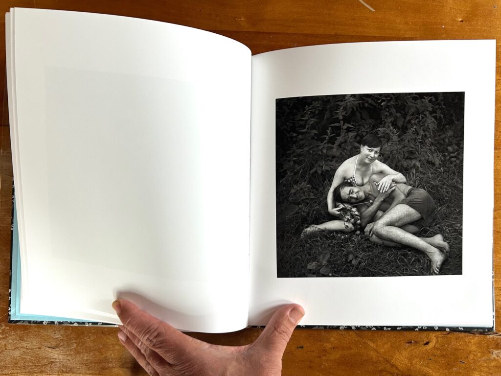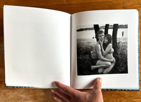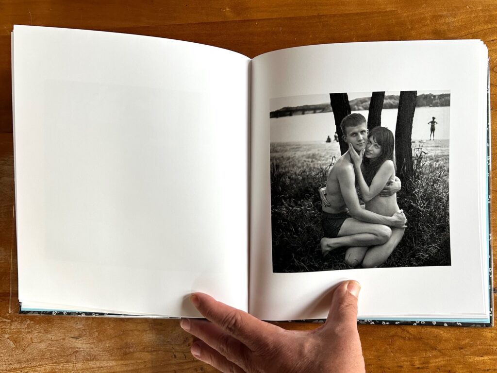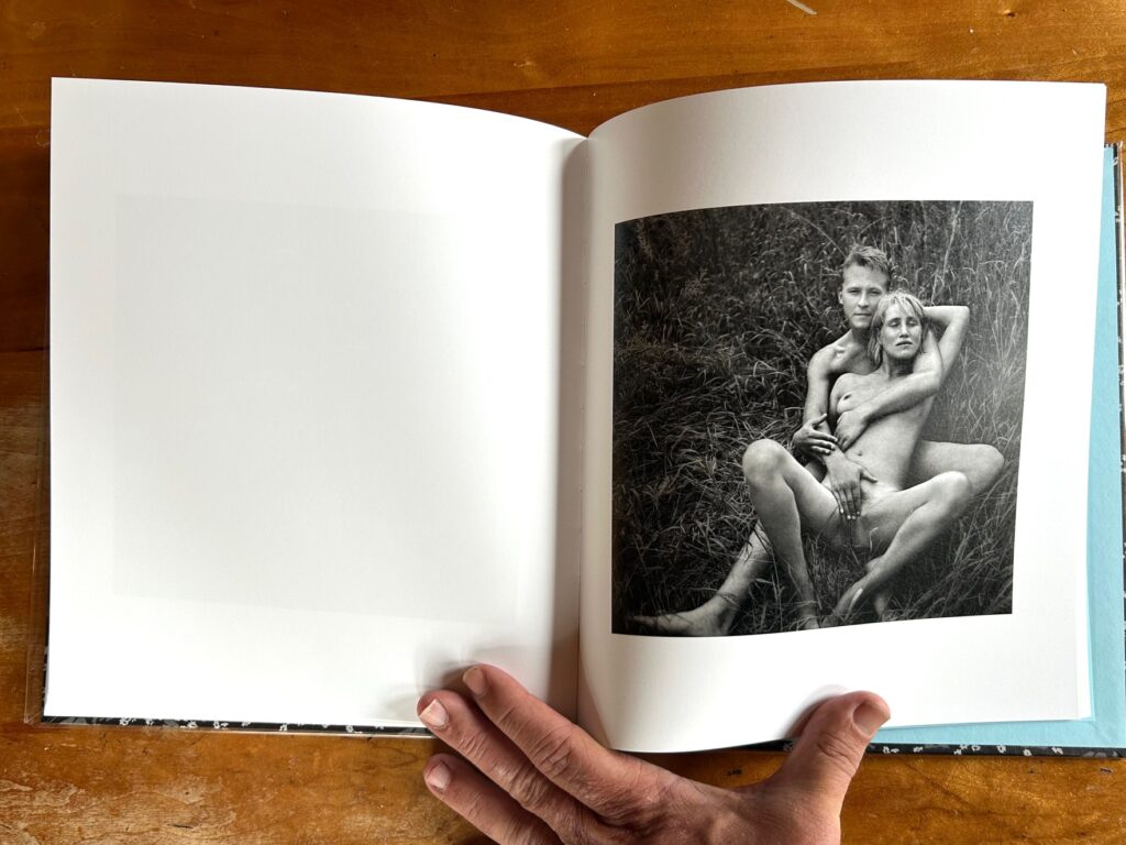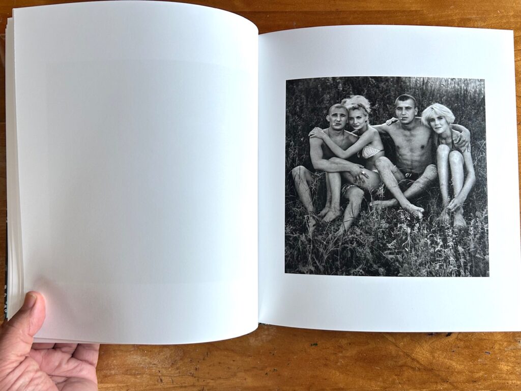 A handful of photographs depict solitary figures, but the vast majority join multiple people together. Almost without exception, Bakhavev’s subjects are connected through human touch. They hug, embrace, lean, or just hold hands. A middle aged couple spoons comfortably against each other in one photo, with the woman’s arms circling the man’s face. Another shot captures a group of bare chested men lazing in the grass, arms entwined in a six-part pretzel. In another photo, Bakharev captures a naked young couple in flagrante during foreplay. Viewed cumulatively, arms, hands, and fingers join people, pages, and the book itself.
