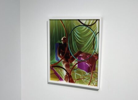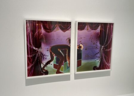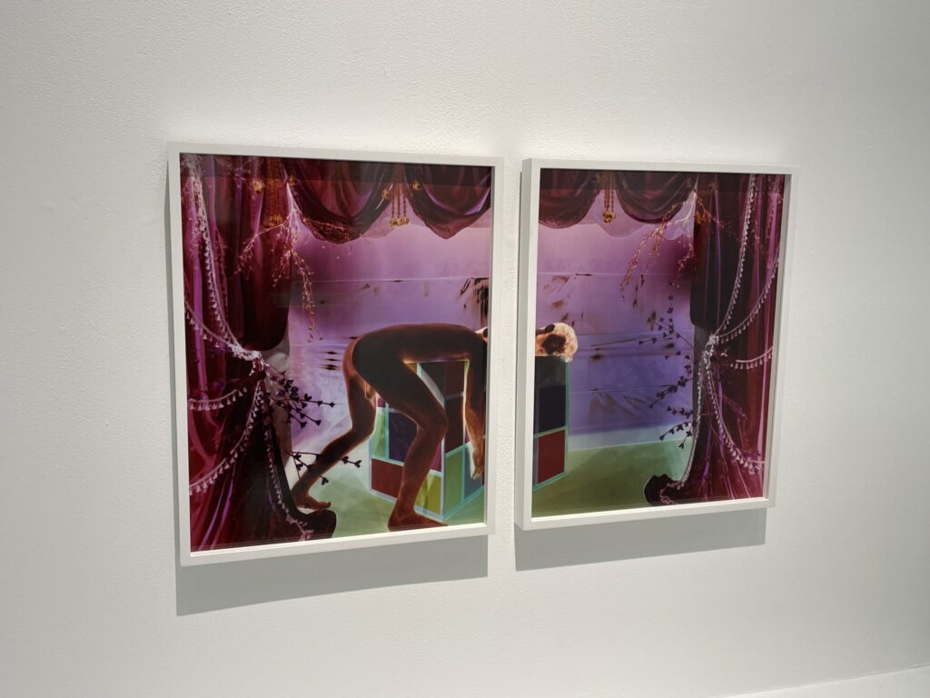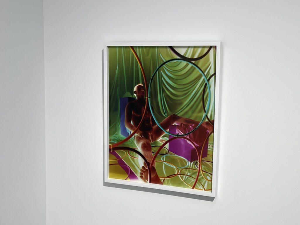 While there were a few reclining male nudes in Calafiore’s 2018 gallery show (reviewed here), those images now feel like an aesthetic stepping stone to a much fuller exploration of the available possibilities. Several of the new works push the earlier festive atmosphere of flowers and polka dots toward further extremes of exhausted celebration, with sets overstuffed with cascading streamers, ribbons, palm leaves, hula hoops, curtains, pillows, upholstered furniture, and other draped fabrics. Most of the bodies in these pictures seem to have fallen into a satiated slumber, their nude forms slumped over tables, passed out in armchairs, and crumpled on the floor, surrounded by the decadence of the decorations. There is a conscious theatricality to these setups, especially when the colors are tweaked and twisted and the curtains frame the stages, that makes them feel almost hallucinogenic, like the swirling dreams (or memories) of Edenic party goers left limp by the surrounding pleasures.