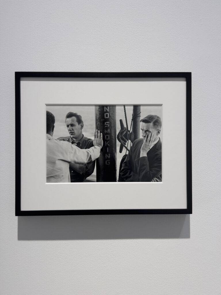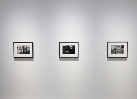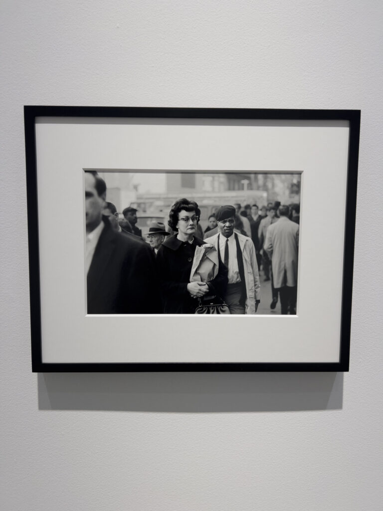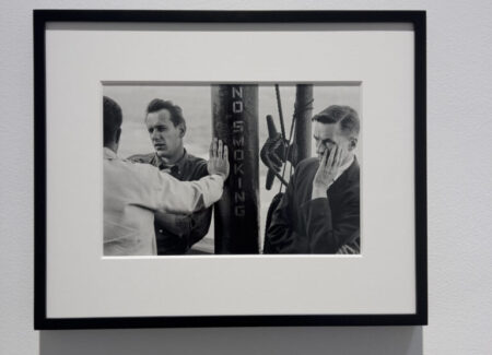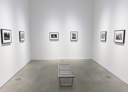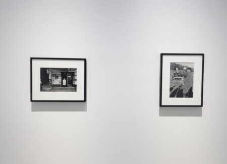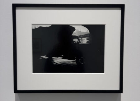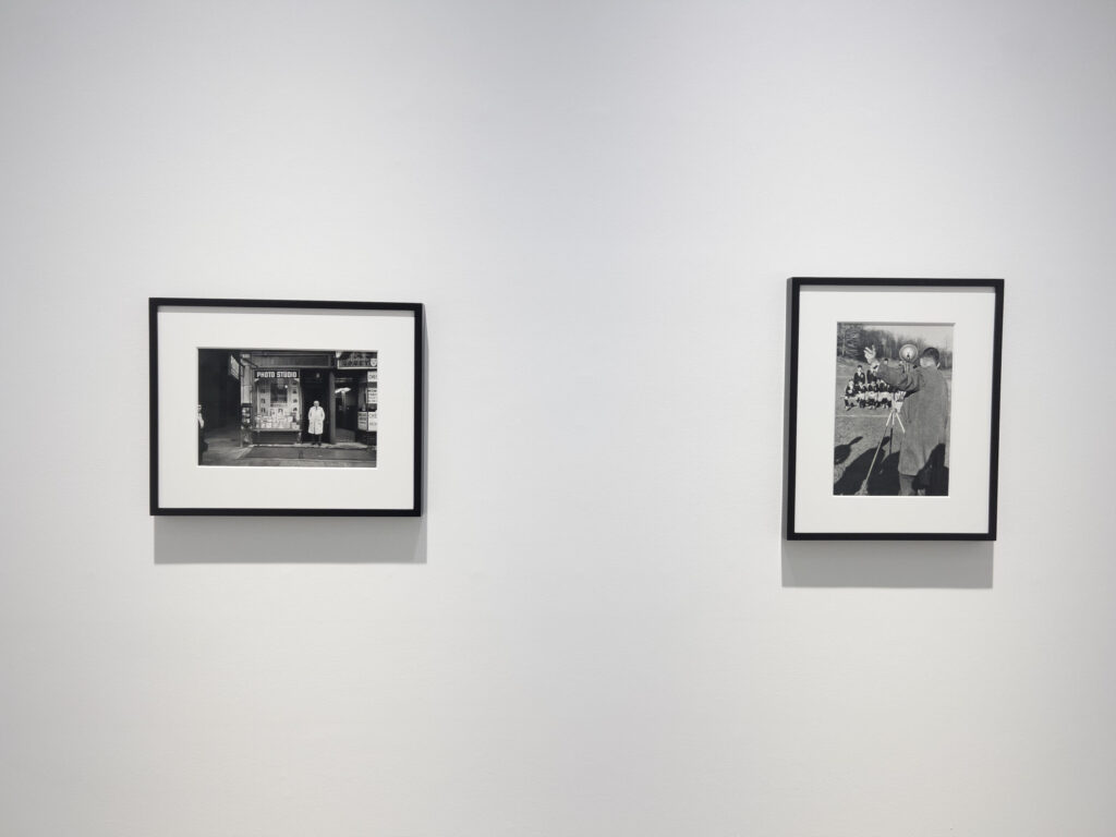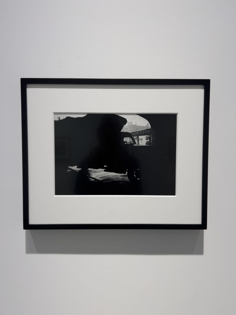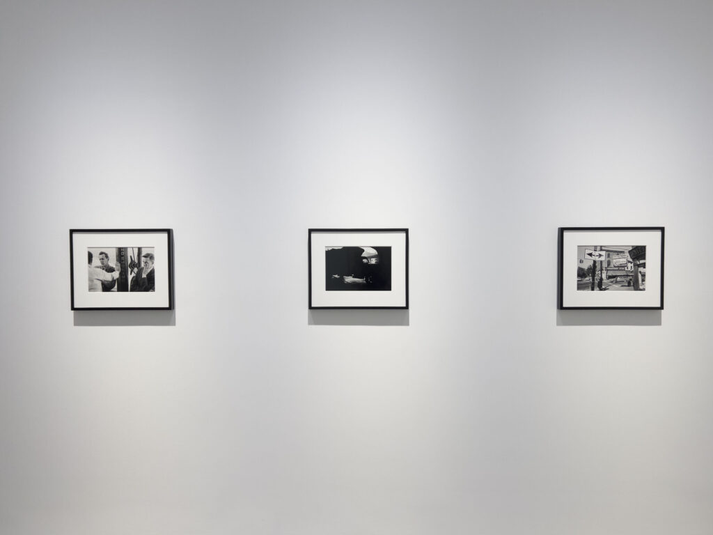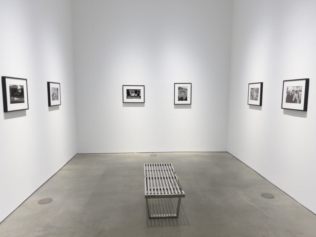 JTF (just the facts): A total of 8 black and white prints, matted and framed in welded black frames, and hung against white walls in the back project room. All of the works are silver gelatin prints, made in 1960, 1963, or 1964 and printed in 2025. Each is sized roughly 9×14 inches (or the reverse) and is available in an edition of 5+2AP. (Installation shots below.)