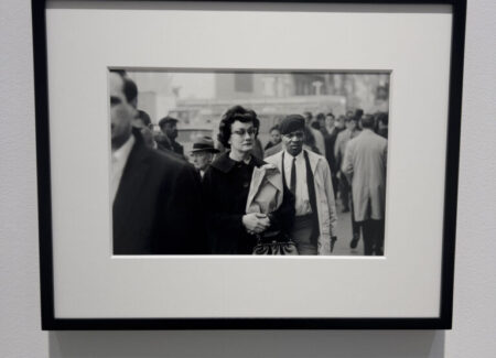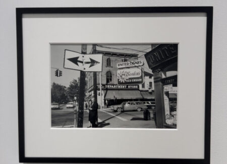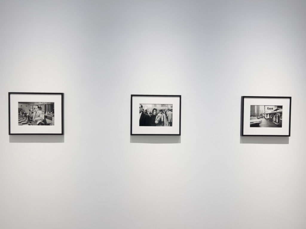 The rightmost wall, the third and final in the room, also holds three formally mounted horizontal photographs. The first, from New York, depicts the interior of a period barber shop with the attendant in the center foreground, leaning against one of the barber chairs and drinking from a bottle. The second, also from New York, is an interestingly observed street scene. Everyone on the street appears to be a man dressed in a suit and coat with the exception of the person at the very center: a woman in horn-rimmed glasses, her hair painstakingly curled, holding a brown paper bag and pocketbook that is half out of frame at the bottom of the image. Three other figures in the street scene are particularly intriguing. The man on the very left of the frame who is half in and half out, as well as out of focus, another man whose head emerges from between two shoulders of other figures, and the third, an African-American man in a beret, suit, and tie, who is squinting at the photographer. The final image in the gallery and on the wall is a carefully seen Manhattan gas station street scene that is a poignant precursor to the frames that would come later from Shore out west in his “American Surfaces” work. Many of the same familiar trappings are present: the cars, the gas station, the signage, and uniquely in this early work, the people walking on the Manhattan sidewalk in the distance with the high-rises in the background.