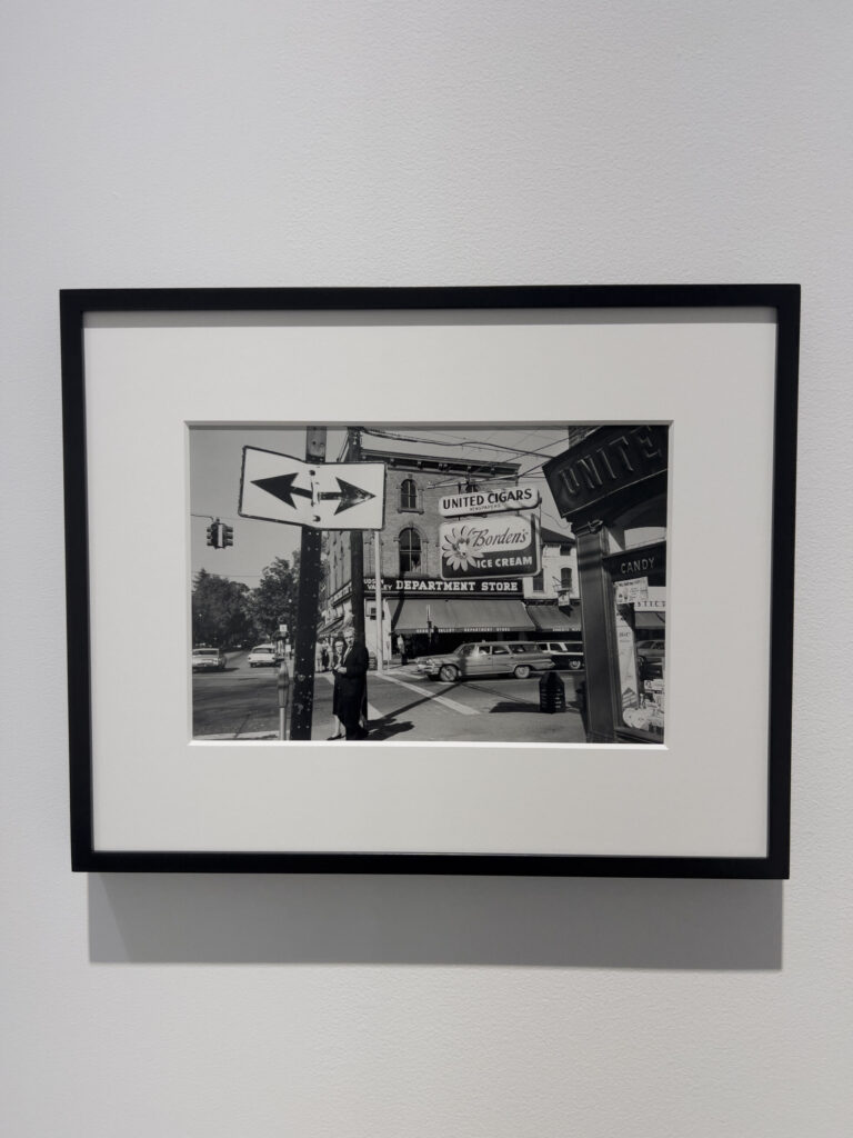 Walking around the gallery, from left to right, we first see a wall of three prints. The first, from New York, is a horizontal image of three men on a ferry, all facing away from the camera’s lens with a pole cutting right through the center of the frame and the words “no smoking” scrawled onto the beam that is center stage in the image. The second, also from New York, is an unusual and rather profound image of a truck seen at close range, almost entirely in shadow. The bed of the truck appears distended, and as I expressed enthusiasm about this photograph with a colleague, Tanya Marcuse, she revealed to me its incredible echoes of a Robert Motherwell painting. The third photograph on this wall, from Rhinebeck, is a photograph that seems to have been made during a family trip upstate, as the artist’s parents are depicted in the foreground looking directly at the photographer with an array of signage, architecture, and of course, the four way intersection moving in every direction around the frame.