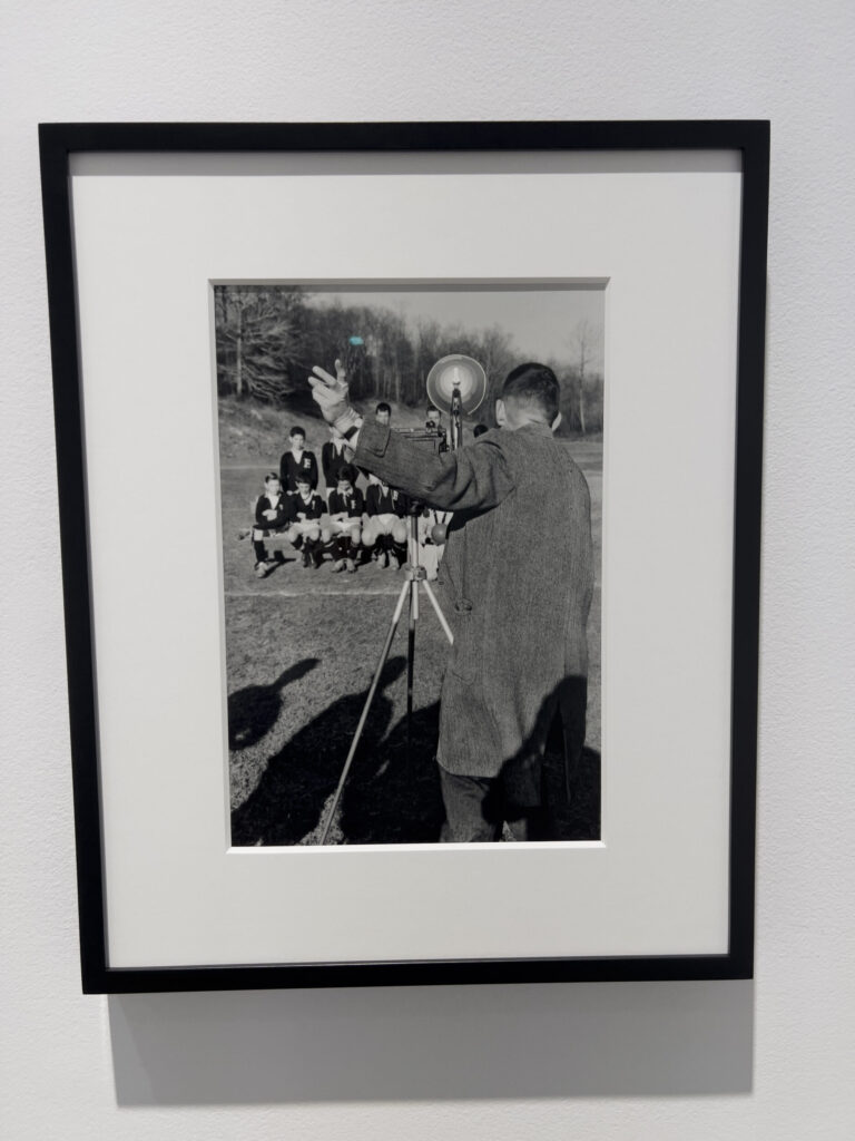 On the far wall are two photographs, both charged with conceptual richness in the ways they engage the aboutness of photography. The first, a horizontal image from New York is a street view of a photography studio (known by its sign in the window), with a variety of signage interestingly cropped on the top and right edges of the frame. Two figures appear in the image: the first in the left foreground, framed both in and outside of the frame, just on the edge, and then a second, perhaps the photo studio technician, who appears just off center to the right. While the arrangement of the storefront is depicted asymmetrically, it holds a balance between the blacks on the left side of the image and the signage on the right side that feels incredibly well composed. The second image on the wall, from Tarrytown, is a vertical made during Shore’s school days as a student at the Hackley School. This photograph seems the most adolescent to me, as it showcases the shadow of the photographer (Shore) on top of the photographer photographing his class. There are four shadows in the foreground, with the shadow to the right being the one indicative of the artist, as we can see the vantage point and the elbow that symbolizes the ubiquitous photographer’s stance.