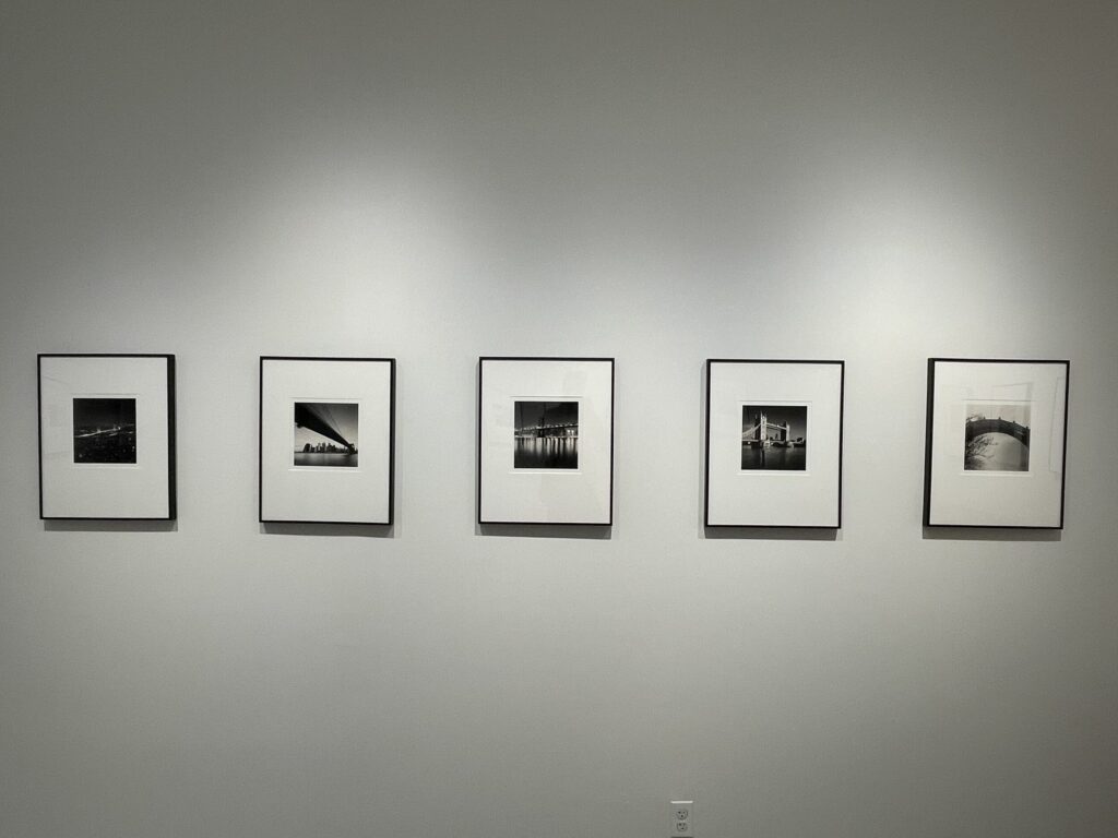 Each of Kenna’s bridge pictures, as seen in this tightly curated show, fits the definition of a grandly aspirational bridge photograph. In examples from around the globe, Kenna offers us variations of tall towers, long spans, sparkling lights, repeated archways, and water-based reflections, even the most recognizable forms (like the Sydney Harbour Bridge, the Golden Gate Bridge in San Francisco, the Brooklyn Bridge in New York, the Pont Neuf in Paris, and the Tower Bridge in London) seemingly seen with their best profiles put forward. Even if Kenna has placed his camera in relatively the same place as other master photographers before him, his pictures build on those visual histories with warmth, acknowledging those views and then remixing them anew.