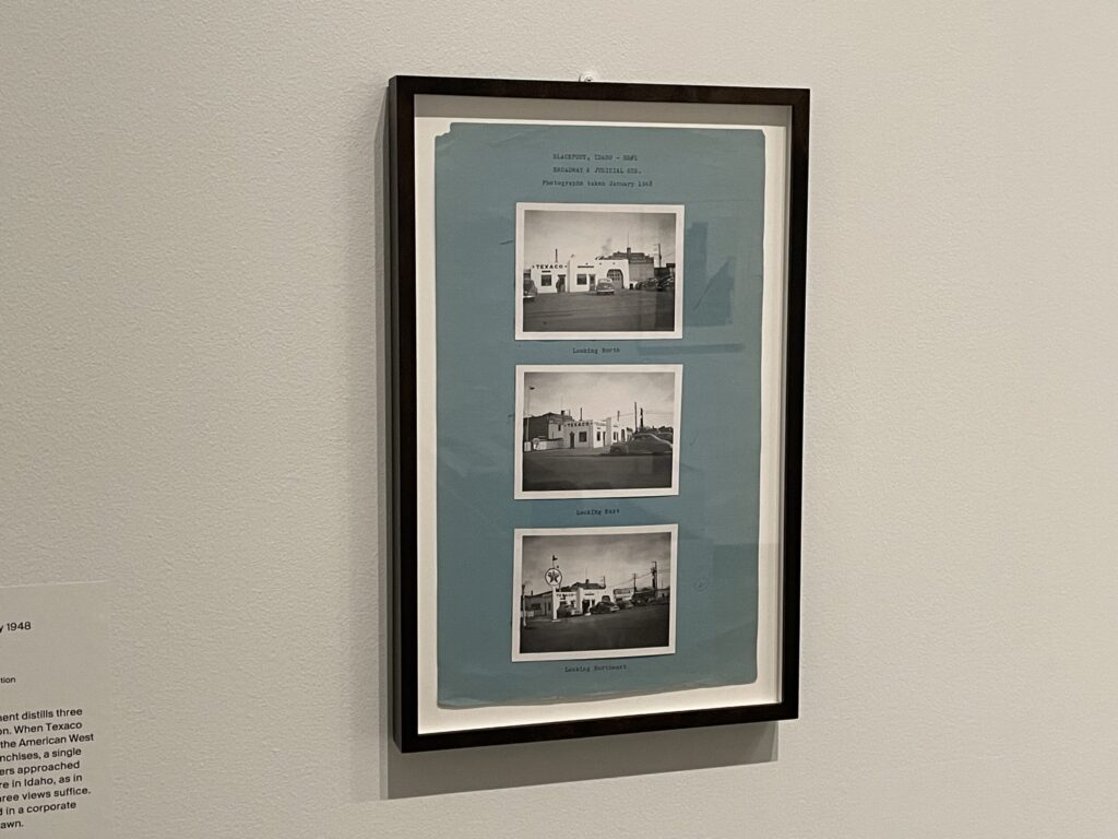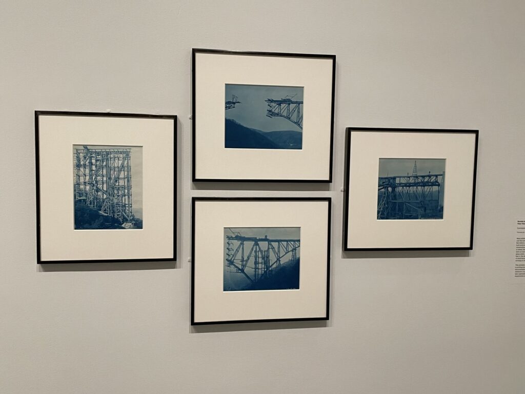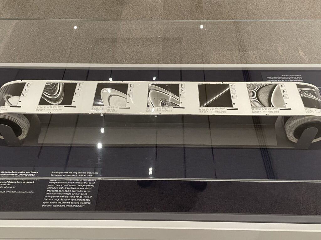 In more recent years, Walther applied similar logics and frameworks to vernacular discoveries, seeing structured thinking and sequential image making in a range of unlikely photographic places. Here we see anonymous circulating views of a 1940s era gas station in Idaho, in-process construction images of a viaduct in France, and automated images of Saturn from the Voyager 2 space probe, each a resonant example of Walther’s thinking process. The three projects also allude to adjacent modes of analyzing photography, exploring time-based series as well as alternative processes (like the cyanotypes and NASA artifacts.)